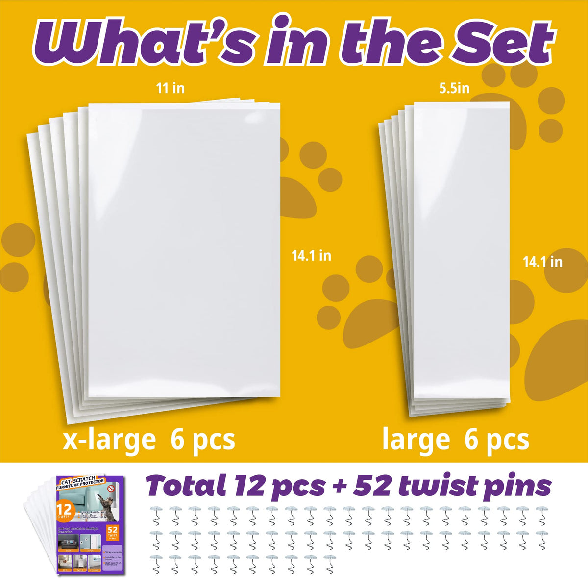 Anti Cat Scratch Furniture Protector-12 Pack Single Side Couch Protector For Cats, Self-Adhesive Cat Tape For Furniture, Clear Cat Scratch Deterrent For Furniture Door Walls (12P+52 Pins)