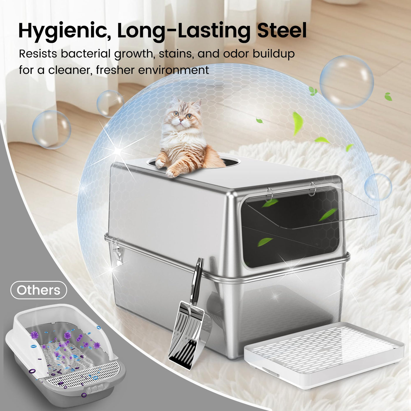 Aothey Stainless Steel Enclosed Cat Litter Box, Large XL, Silver, Odor Control, Easy to Clean, Durable with High Sides