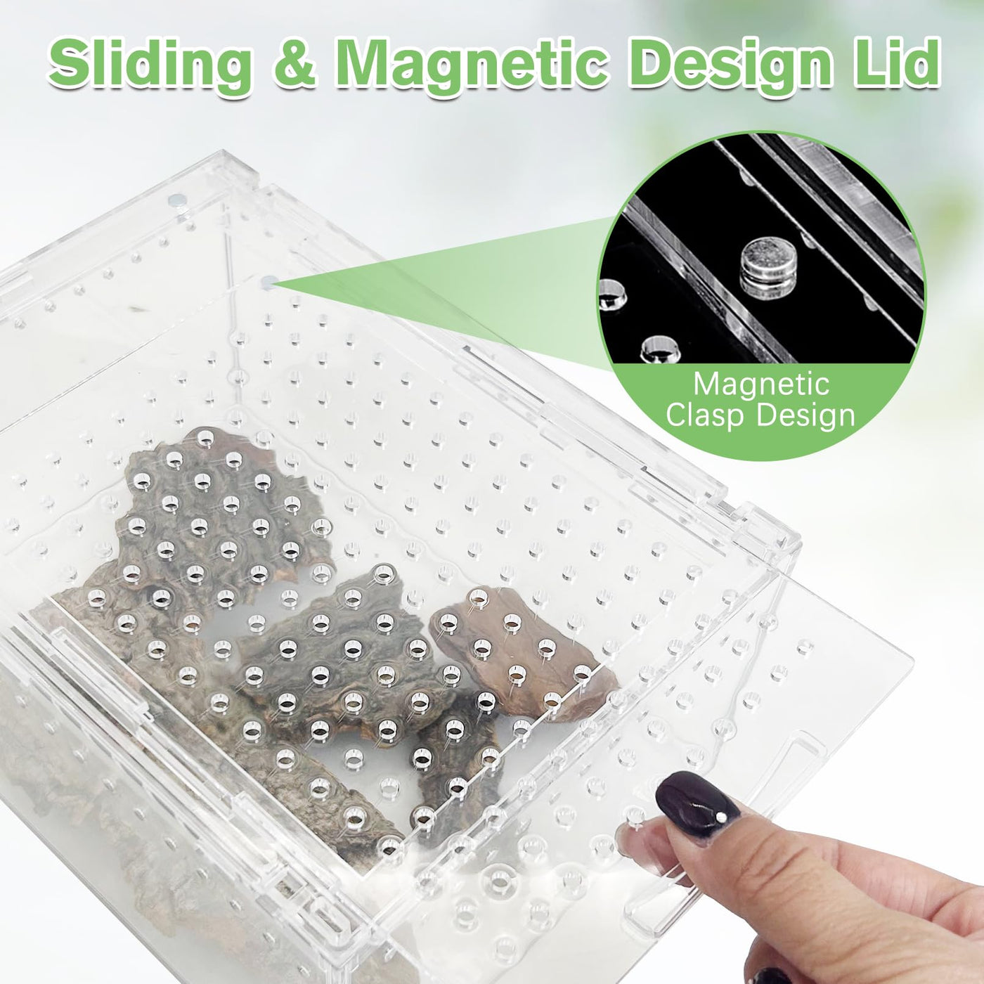 Apatal Acrylic enclosure for tarantula is made of durable acrylic material. With sliding cover and magnetic closure, you can easily feed your pets. It is a 360 degree full view visually completely transparent insect enclosure, that is ideal for tarantulas, geckos, frogs, mantis, spiders, scorpions, snails or any other insects. 1.360Full View 360full view visually completely transparent,easy to observe your pets at anytime anywhere. 2.Sliding Cover with Magnetic Top magnetic sliding closure for easy feeding and preventing pets eascape. 3.Ventilation Holes Design The ventilation holes keep fresh air flow into the habitat, which are good for your lovely pets growth. 4.Waterproof Design Molded base holds water or substrate without leaking. Product Specifications: Color: Transparent Material: Acrylic High Quality Acrylic Material The spider enclosure is made of high-quality acrylic material, durable and sturdy.