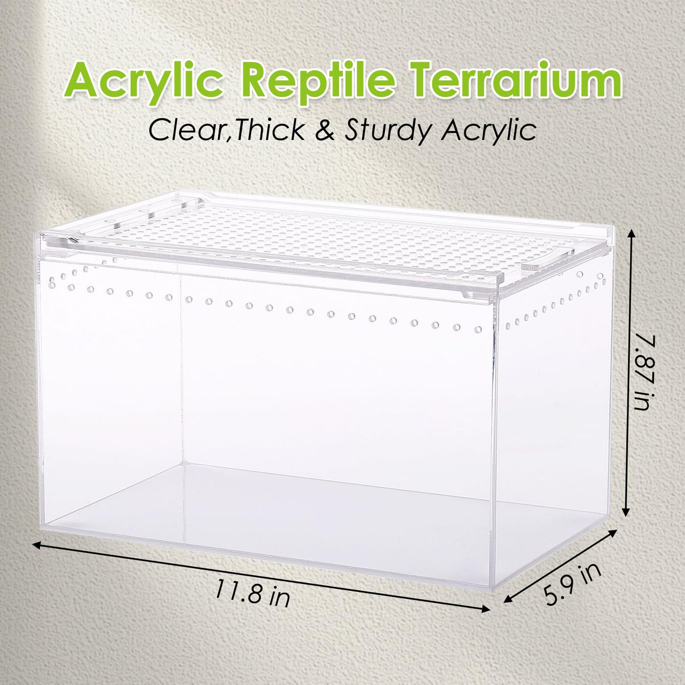 Apatal Acrylic Reptile Terrarium Cage Is Made Of Durable Acrylic Material. With Sliding Cover And Magnetic Closure, You Can Easily Feed Your Pets. It Is A 360 Degree Full View Visually Completely Transparent Tarantula Terrarium, That Is Ideal For Tarantulas, Geckos, Frogs, Mantis, Spiders, Scorpions, Snails Or Any Other Insects. 1.360Full View 360Full View Visually Completely Transparent,Easy To Observe Your Pets At Anytime Anywhere. 2.Sliding Cover With Magnetic Top Magnetic Sliding Closure For Easy Feeding And Preventing Pets Eascape. 3.Ventilation Holes Design The Ventilation Holes Keep Fresh Air Flow Into The Habitat, Which Are Good For Your Lovely Pets Growth. 4.Waterproof Design Molded Base Holds Water Or Substrate Without Leaking. Product Specifications: Size: 11.8X7.87X5.9In Color: Transparent Material: Acrylic High Quality Acrylic Material The Spider Enclosure Is Made Of High-Quality Acrylic Material, Durable And Sturdy.