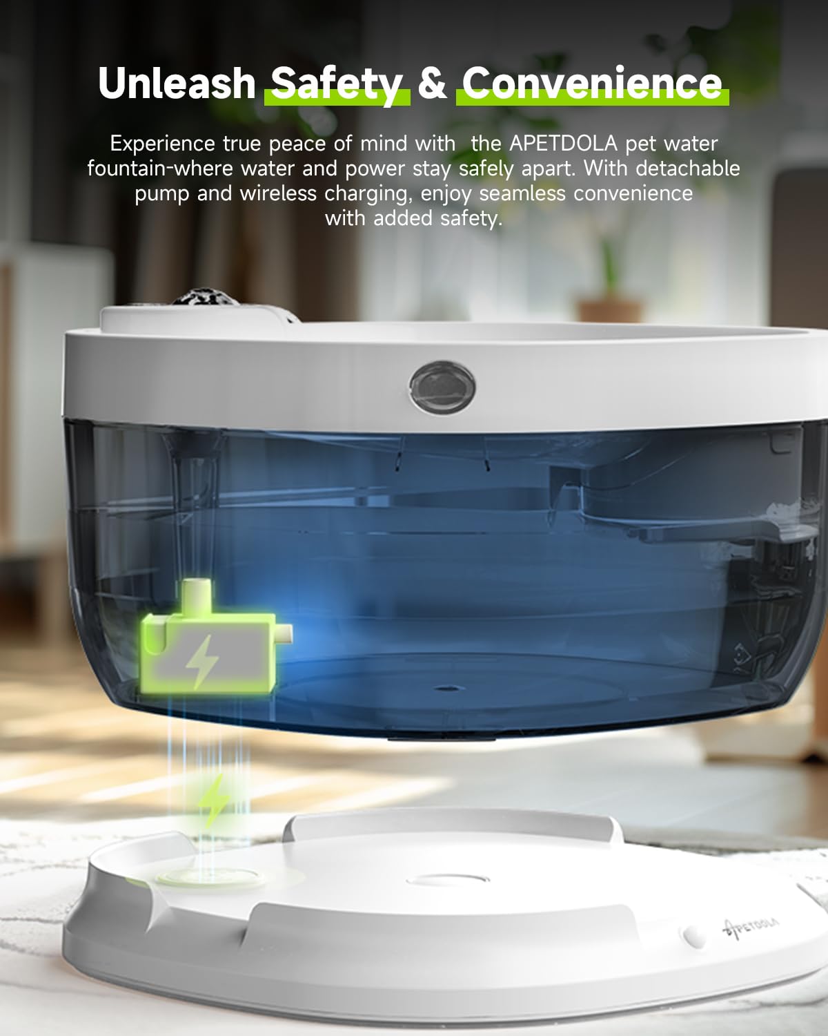 Hydrate Where They Feel Comfortable: With Our Wireless Pet Fountain, You Can Place It Anywhere You Desire Without Being Restricted By Power Cords. Whether It'S In The Kitchen, Bedroom, Balcony, Or Any Other Outdoor Location, You Have The Freedom To Choose. Long-Lasting Battery: The High-Capacity 5000Mah Battery Ensures Continuous Operation For 30-45 Days, Eliminating The Worry Of Power Outages Or Water Shortages During Short Trips. The Water Level Window Allows You To Easily Monitor The Remaining Water. Enhanced Sensor Mode: The Cordless Pet Water Fountain Features An Upgraded Sensor Mode With A Sensing Range Of 4-6 Feet/320. It Dispenses Water For 12 Seconds When It Detects Your Pet, Encouraging Hydration While Conserving Energy. Switch Between 3 Modes With Just One Button: Sensor Mode, Timer Mode, And Continuous Mode (Support For Plug-In Use Only). Large Capacity And Filtration System: With A 305 Fluid Ounce/7-Liter Capacity, Your Dog Can Enjoy Up To 15 Days Of Continuous Drinking. The 6-Layer Vertical Filtration System Ensures That Every Drop Of Water Is Clean And Free Of Hair, Sediment, And Dirt, Providing Oxygen-Rich And Great-Tasting Water For Your Pets. Easy To Clean: Thanks To The Wireless Pump And Detachable Water Tank, Maintaining And Cleaning This Pet Water Fountain Is A Breeze. Say Goodbye To Traditional Water Pump Cords Exposed In Water-Our Wireless Pump And Charging Base Eliminate External Wires, Making It Safe And Comfortable For Pets To Drink.