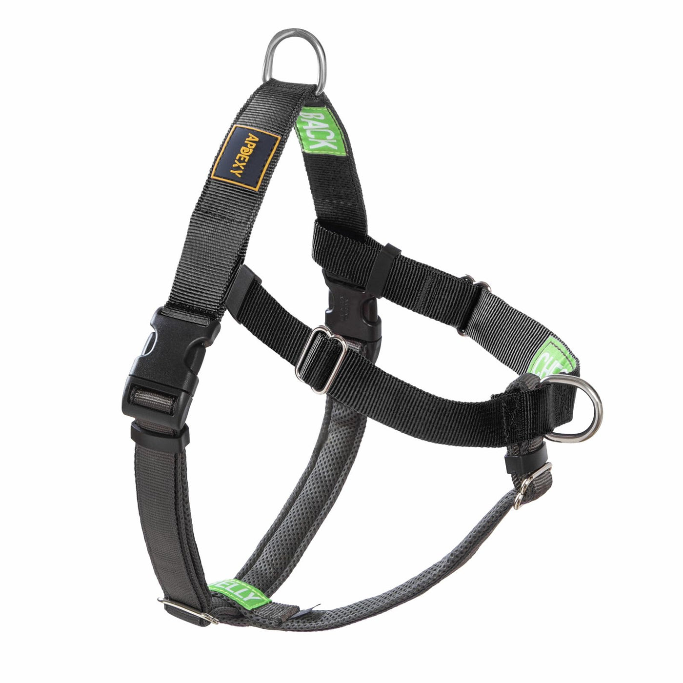 DESIGNED TO HELP STOP PULLING: Enjoy freedom on walks with our anti-pull dog harness.Two leash attachment points ensure no more pulling with easy walking. A specifically designed front clip webbing across the dog's chest could stop choking and gagging when the dog pulls. COMFORT AND OPTIMAL CONTROL: The no-escape dog harness features a soft and breathable three-layer sandwich mesh-lined nylon webbing, which can improve airflow and bring the ultimate wearing comfort to the dog. There are two connection points between the dog halter harnesses. The Back-Clip offers comfort and visibility while walking, and the Front-Clip increases control and training. HIGH-QUALITY AND DURABILITY: We are committed to designing and producing high-quality, strong, and durable dog easywalk harnesses. It features two strong stainless steel D-Ring hardware that will never rust, two quick-release buckle systems from buckle expert Duraflex, and durable reinforced nylon webbing. REDUCE STRESS AND TRAIN EASILY: This freedom no-pull harness has front clip webbing across the dog's chest instead of throat and neck. To stop choking and gagging when dealing with pulling. With a leash attached to the strong front D-Ring, it will simplify the training process and ensure safety and positive ease of training. QUICK AND EASY TO WEAR: Our dependable No-Pull dog harness is very easy to use. Sewn-in 'BACK', 'CHEST', and 'BELLY' instructions labels for quick and clear positioning make it easy to put on your dog. PERFECT FIT: With 4 metal triglide adjusters and 2 UTX quick-release buckles, our dog halter harness can create ultimate comfort and freedom fit for all dogs.