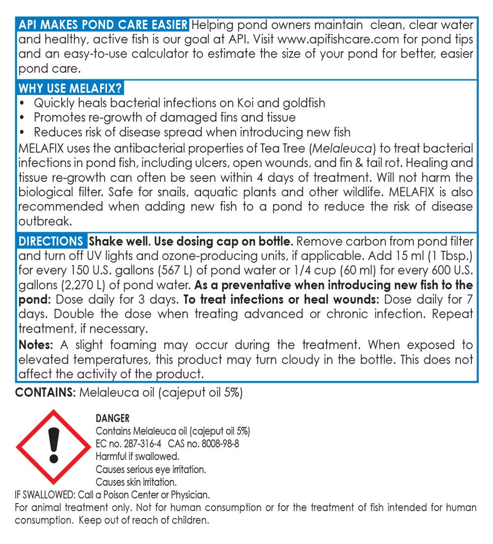 API POND MELAFIX Pond Fish Remedy uses the properties of tea tree (Melaleuca) to treat in pond fish, including ulcers, open wounds, and fin and tail rot. Healing and tissue re-growth can often be seen within four days of treatment. API POND MELAFIX Pond Fish Remedy will not harm the biological filter and is safe for snails, aquatic plants and other wildlife. API POND MELAFIX is also recommended when adding new fish to a pond to reduce the risk of outbreak. This product is for use in freshwater and marine (saltwater) ponds only; do not use it in aquariums or other types of ponds. With API POND products, it’s easy to keep a beautiful pond. For over 50 years, API has been creating innovative, research-driven solutions that make it easier to care for your pond. API POND Pond Treatment Supplies are designed to work in conjunction with each other to provide best results to control algae, promote healthy growth and help control and cure fish s and conditions such as ich and fin rot. They work to provide a safe, hospitable environment for fish such as koi, catfish, perch, goldfish and more. With API, you can spend more time admiring your fish, and less time scrubbing your pond. Make sure to use all products as directed in order to ensure the best results.
