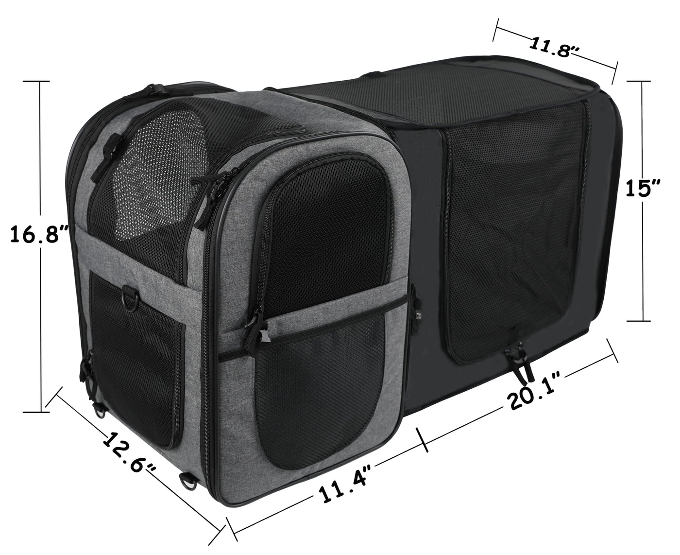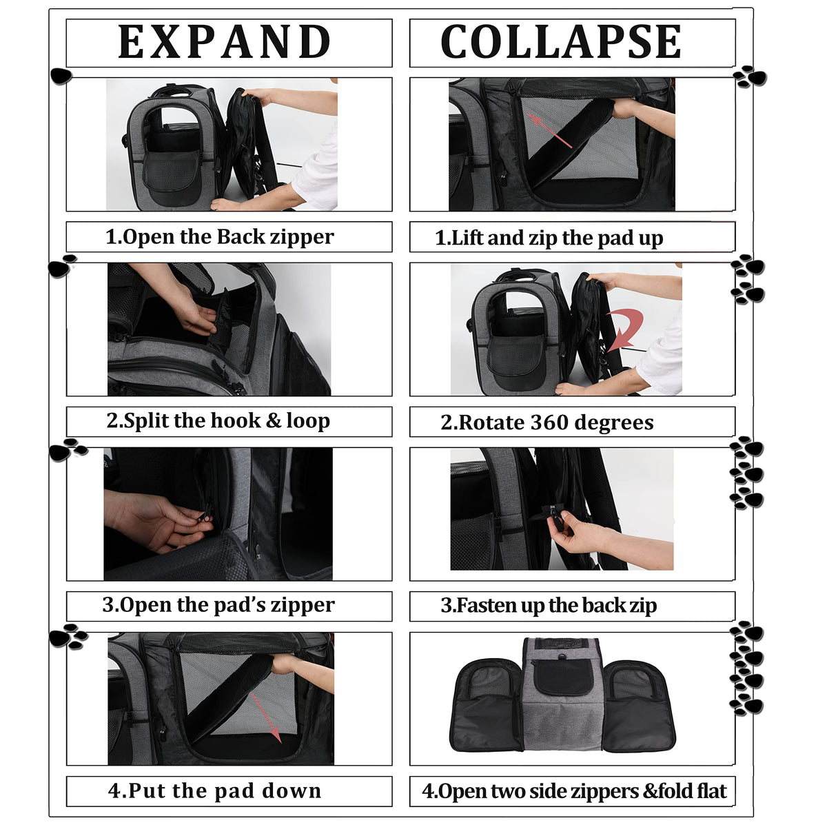 EXPANDABLE & FOLDABLE-Apollo Walker expandable pet carrier(bag size 11.4'' x 12.6'' x 16.8'') additional expansion part size is about 20.4'' x 11.8'' x 15'' which gives your pet more resting space increasing air circulation allowing your pet to move more comfortably and reducing anxiety.