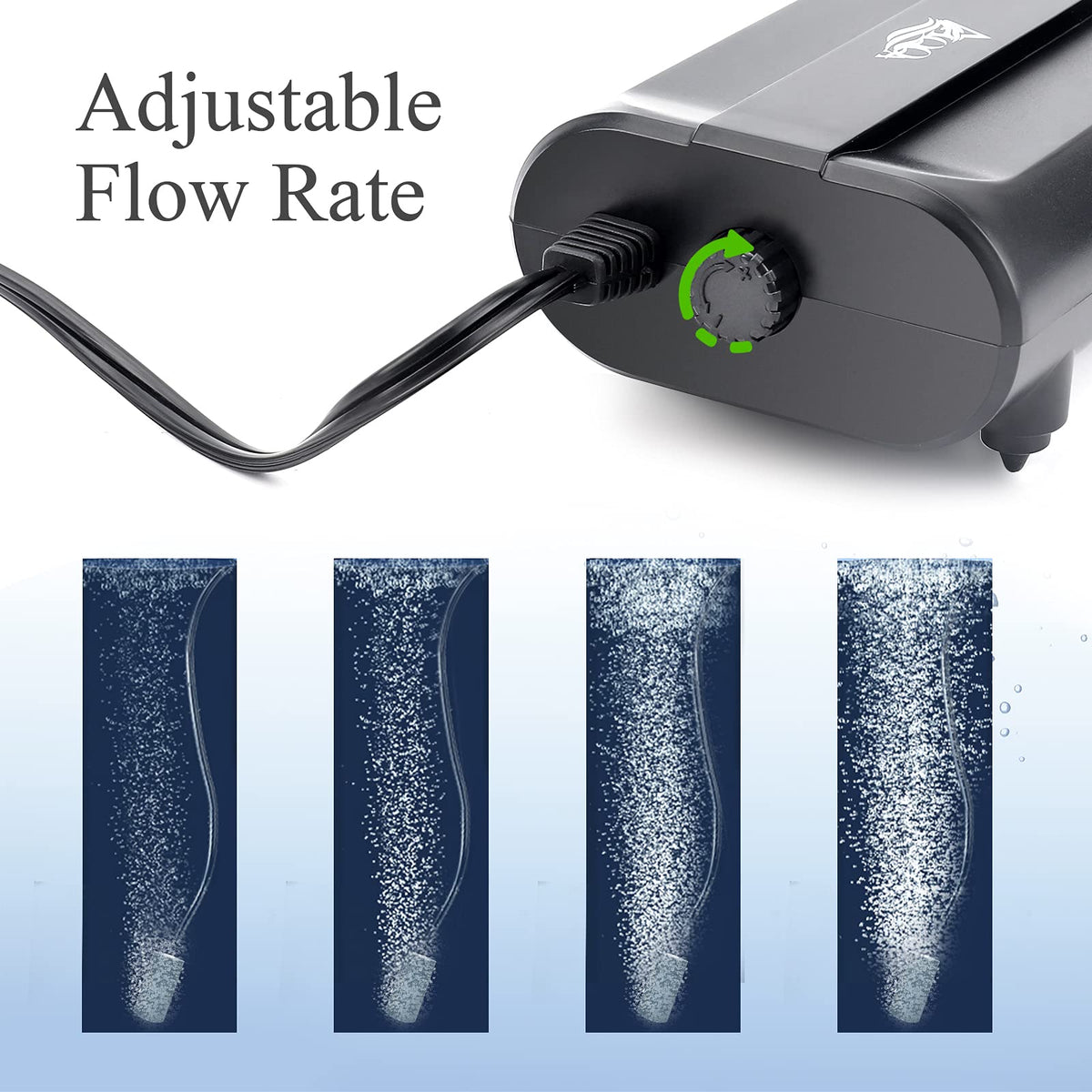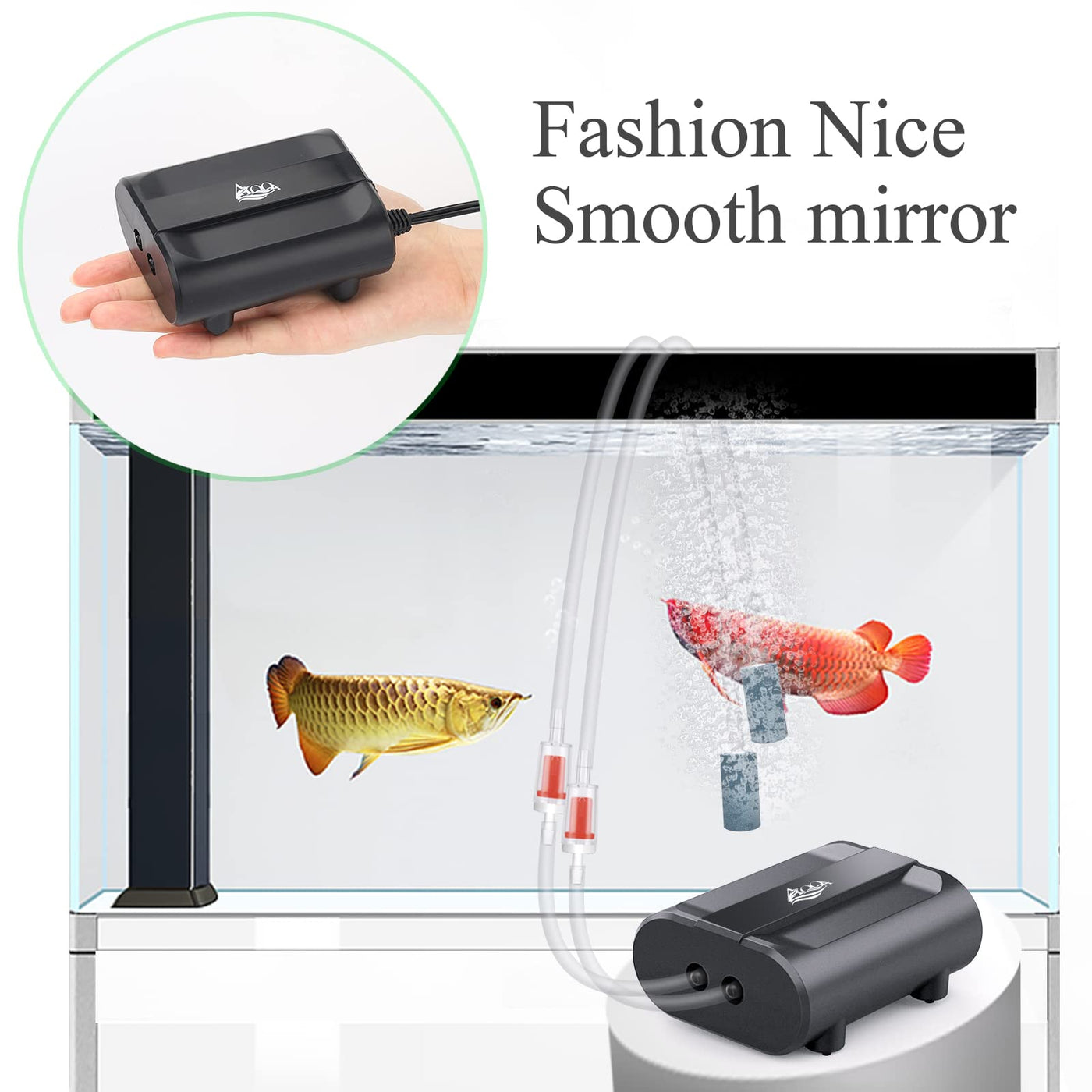 Product Description Product Name:AQQA mini air pump Color:Black Voltage:110v/60Hz Air Flow:5L/min Pressure:0.02Mpa Cord Length:5.9ft Product Size:H*W*L 3.9'x3.15'x1.6' Suggest fish tank:0-160 gallon Package included:1*air pump 2*hose(3.3ft) 2*air stone 3*connectors 2*back flow valves