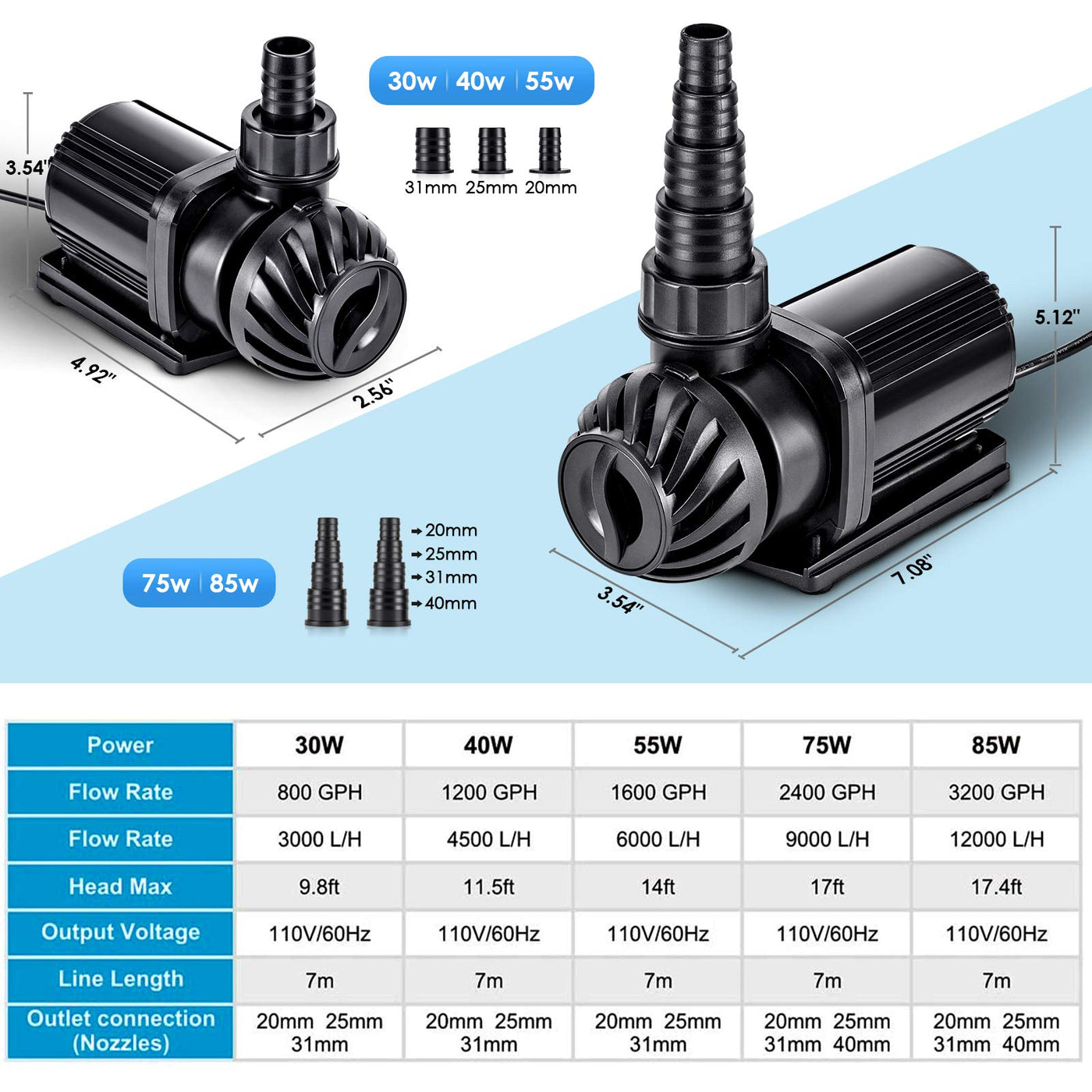 Product Description Product Name:AQQA Multifunction Intelligent Variable Frequency Water Pump Size:30W Flowrate:800GPH ( 3000L/H) Mode:constant speeds and wave maker Controller:LED + touch-control(External) Line length:7m Output voltage:110V/60Hz High Lift:9.8ft Package included:1× User manual 1× AC water pump 1× Controller 1× Bottom suction cover 1× Filter cover 2× O-ring Outlet or inlet fittings as following: