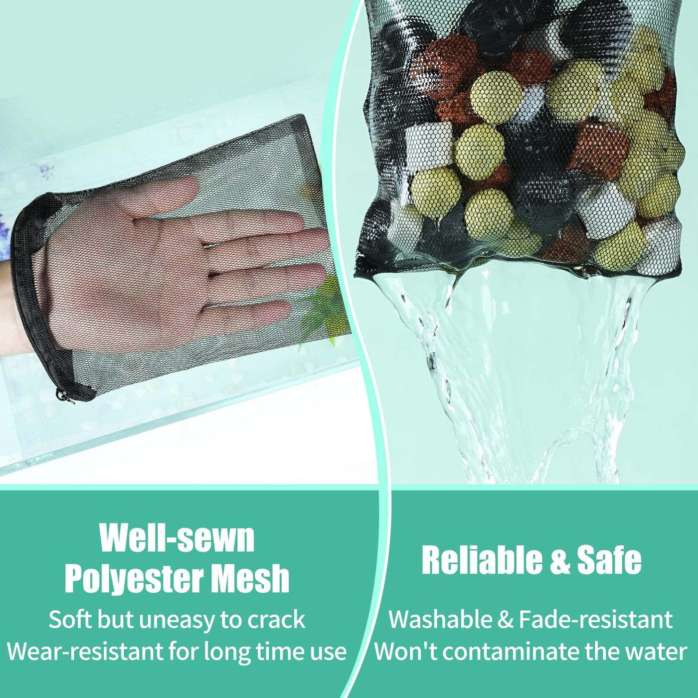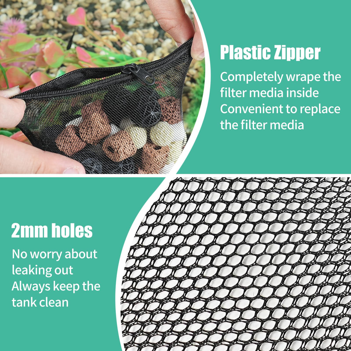 Q: What types of filter media can I use with these mesh bags?A: These mesh bags are suitable for various types of filter media, including bio balls, zeolite, ceramic media, rock, crushed coral, and any other aquarium filter media.