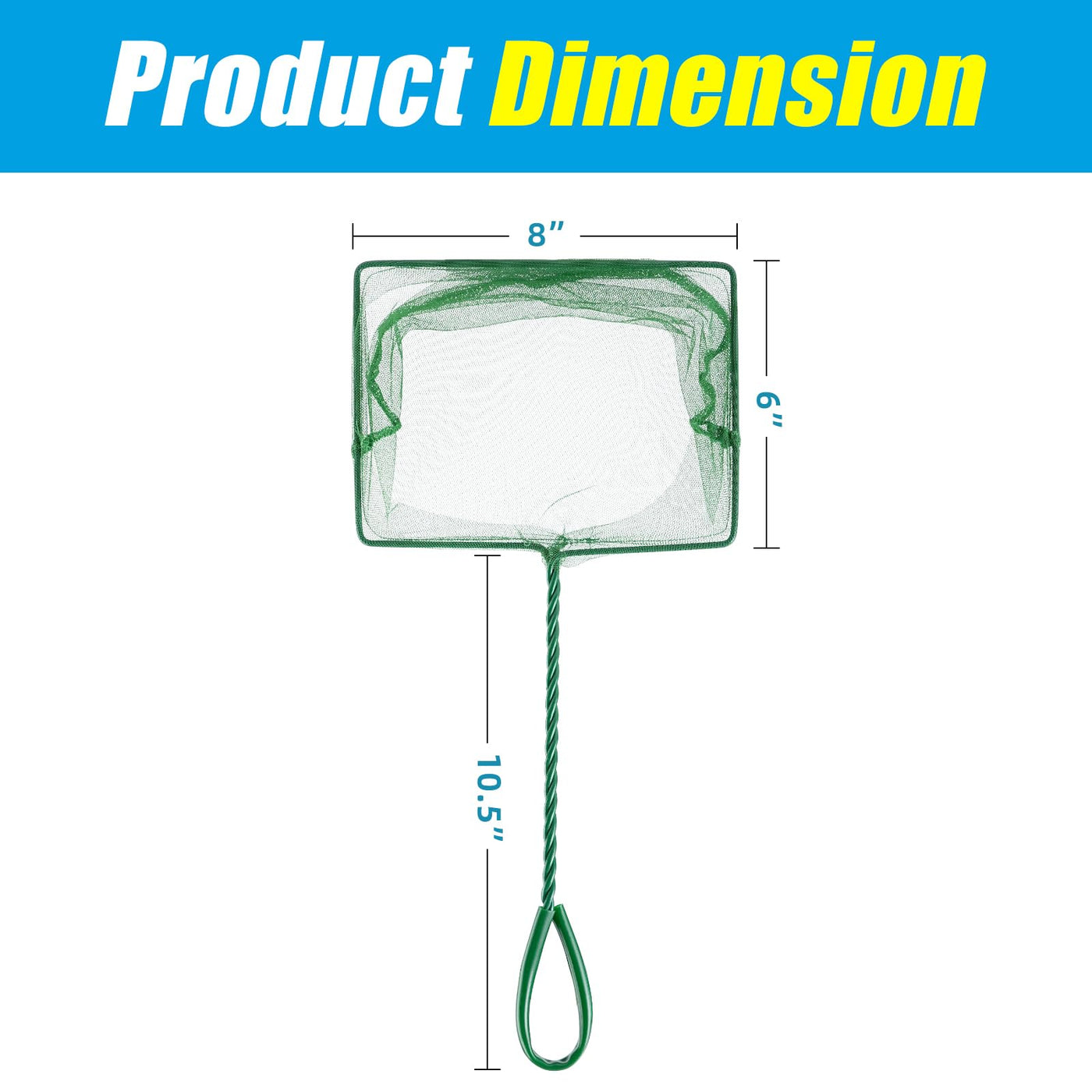 Features: Fine fish net using to transfer delicate fish and clean up small debris from the water. An essential tool for fish tank keeping Soft fine nylon netting reducing the risk of injury while transferring delicate fish, especially suitable for betta and guppy Constructed with 3 pieces of thick wire and a vinyl covered over the handle tail, very strong and durable Came with 10.5 inch long sturdy handle help you to reach deep tank much easier Dimension: Fish net dimension: 8 L x6 W Length of handle: 10.5 Includes: 1 piece of fish net