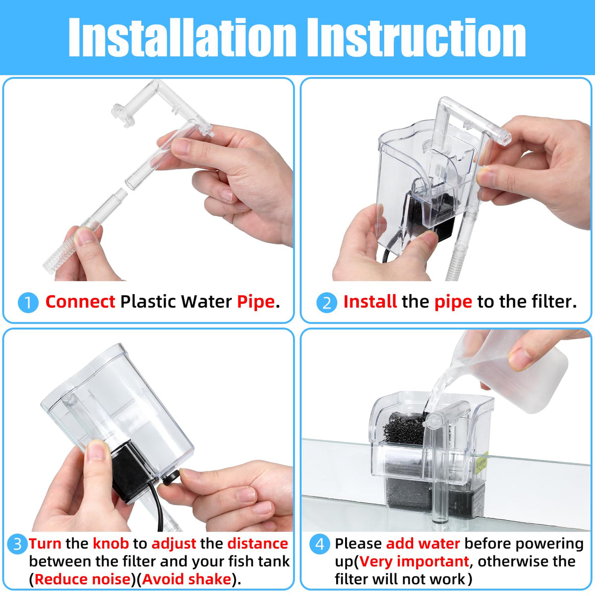 Feature: Provide Superior Filtration With Filter Sponge Inside. Help Water Circulation And Add Oxygen Into The Water Quiet Operation: This Filter Runs Quietly To Deliver Water Through Your Aquarium. Perfect For Your Fish Tank Recommended Tank Size: Up To 3/5 Gallon. Dimension: 3.5''X2''X1.1''/4.1''X3.2''X1.7'' Adjustable Flow Rate, Good For Both Fresh And Salt Water Aquarium Please Note: The Filter Must Be Prefilled With Water Before Running, And The Filter Sponge And Impeller Should Be Cleaned Regularly, We Generally Recommend To Clean Them About Every Two Weeks Specifications: Voltage: 110-120V 60Hz Max Flow Rate: 65/90 Gph Length Of Power Cord: 2.4 Feet Dimensions: 3.5''X2''X1.1''/4.1''X3.2''X1.7'' Includes: 1 Power Filter