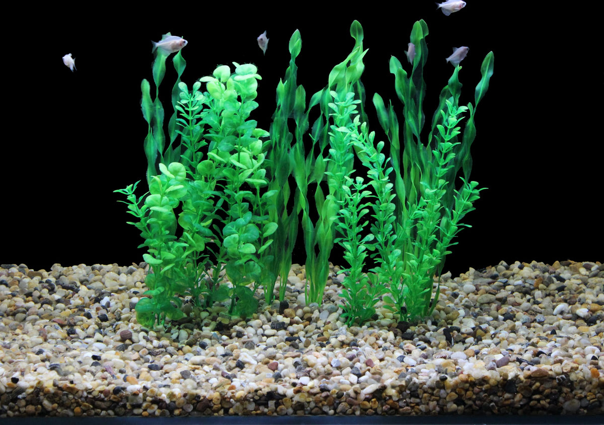 Decorated fish tank with green artificial plants to brighten your aquarium landscape