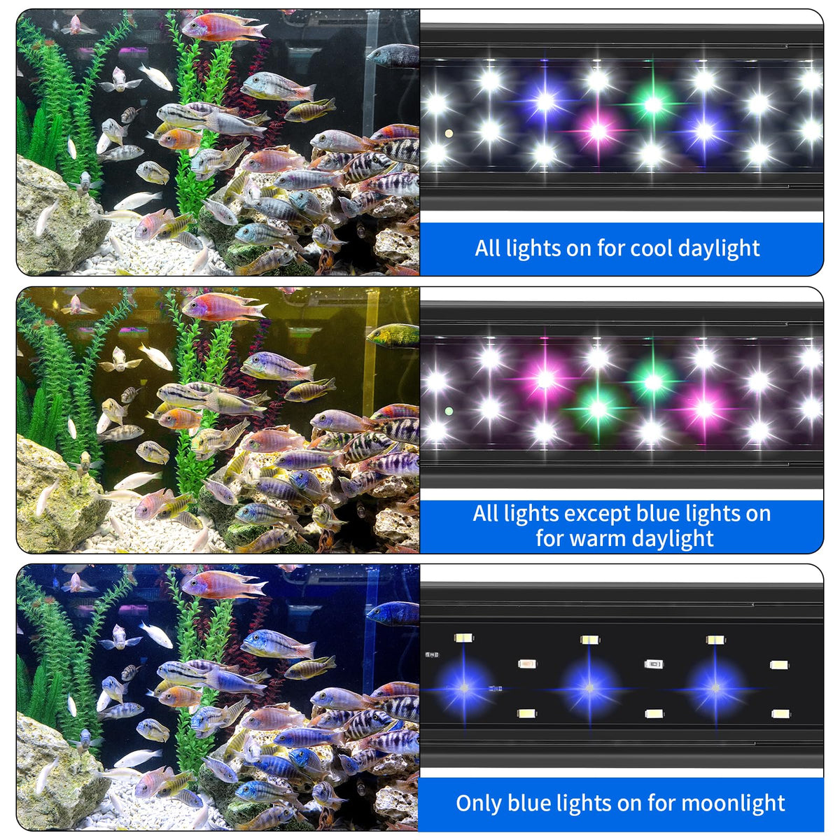 Aquaneat LED fixture provides a high quality, energy efficient light fixture. Long lasting LEDs with no bulb replacement required. FEATURE: Brightness adjustable: 5 levels of brightness in total from 100% to 20% according to your prefer Built-in Timer: provides three timing modes: 4, 8, 10 hours. Set the time according to your preference, and the tank light will automatically be off and on at the designated time Color adjustable with 3 groups of LED lights, each group can be turned on and off separately Group 1: All lights on(White + Pink + Green+ Blue)for cool light effect Group 2: All lights except blue lights on(White +Pink +Green) for warm light effect Group 3: 3 blue lights on for night mode Adjustable mounting brackets for flexibility in 12 -16 aquarium widths Light body without docking brackets: 9.25 L x 2.7 W. Tank thickness: No limit to rim size Configuration: total 22LEDs, 15 pcs 6500K white LED, 3 pcs blue LED, 2 pcs pink LED, 2 pcs green LED Splash guard (not waterproof) Super bright and energy efficient 5730 LEDs, suitable for all freshwater Input : 110V 60Hz SPECIFICATION: Total 22 LEDs, 1320 lumen 15 pcs 6500K White 3 pcs Actinic Blue 2 pcs Pink 2 pcs Green Light Dimension (not include bracket) : 9.25 x2.7 x0.4 Length of One Extendable Bracket: 4.3 INCLUDES: 1 piece of LED light
