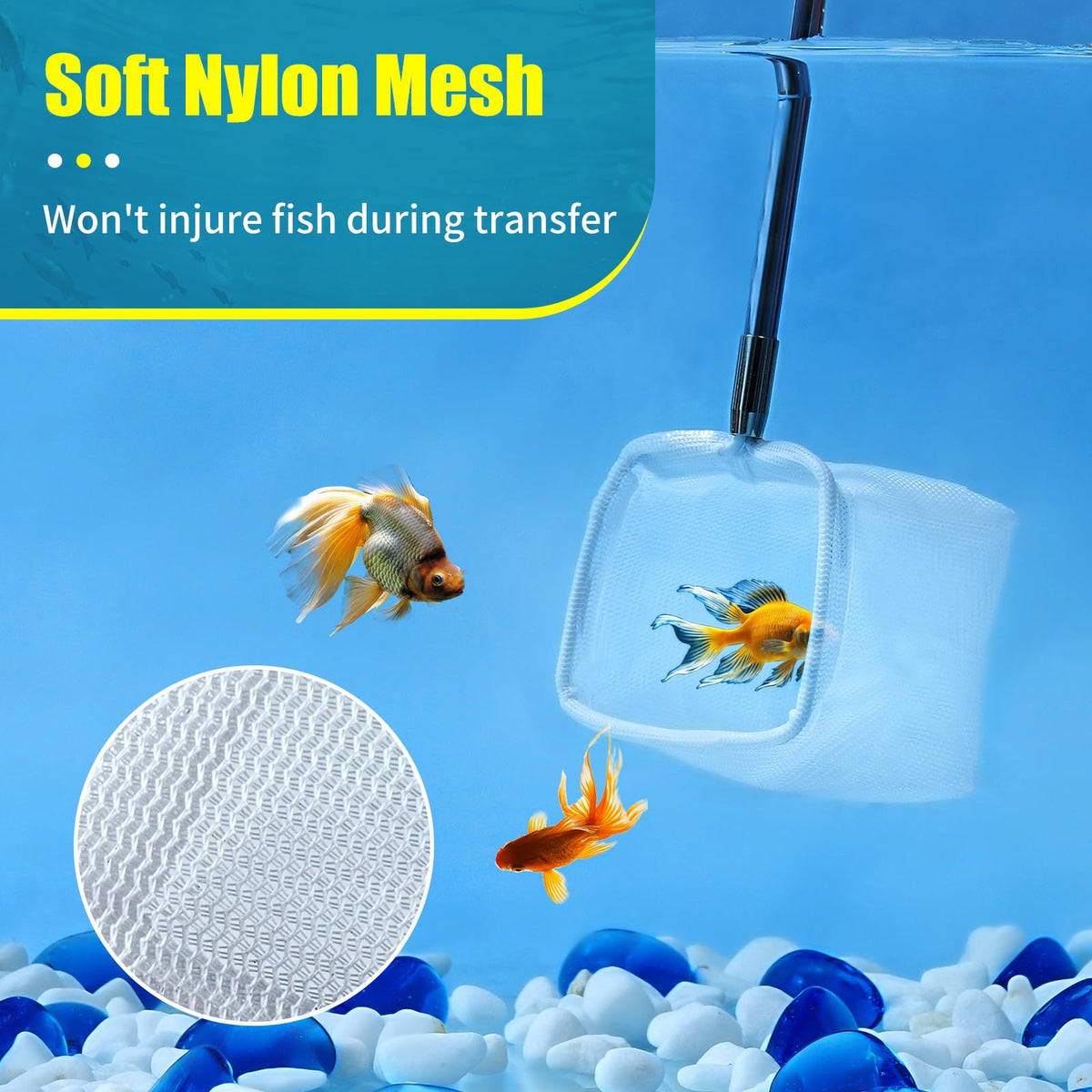 Q: What materials are used in the construction of the shrimp net?A: The net is made from soft fine nylon material, which reduces the risk of injury to delicate fish during transfer.
