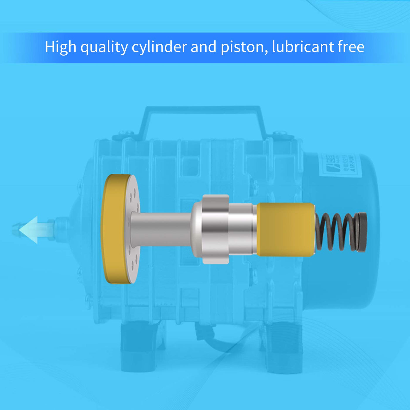Q: Does the AquaMiracle Air Pump require lubrication?A: No, the AquaMiracle Air Pump is designed with lubricant-free and wear-resisting materials for both the cylinder and piston, ensuring durability and low maintenance.