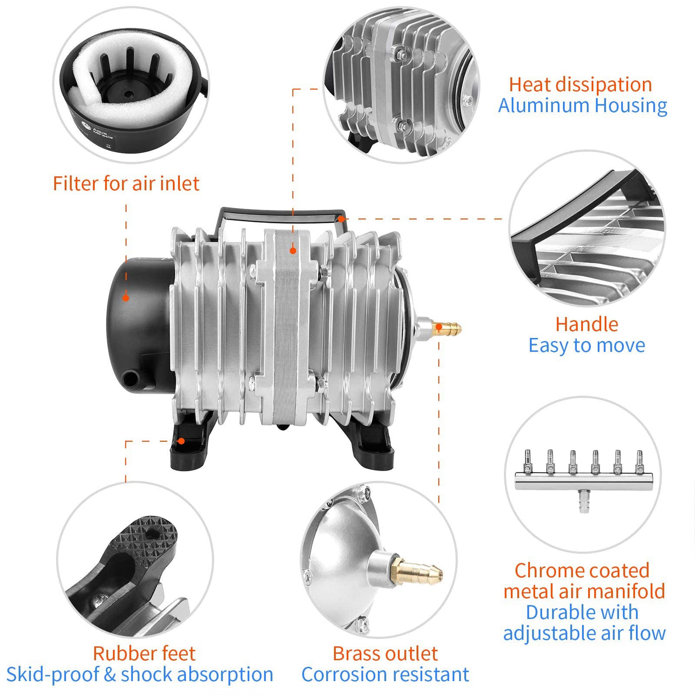 Aquamiracle Is Specializedain Design And Manufacturing Of Aquarium Products Supported By Our Strong Design And Manufacturing Team, We Take The Pride In Our 20 Years+ Experience In Servicing Customers All Over The World This Pump Is Designed With Electromagnetic Technology The Design Features Lubricant Free, Wear-Resisting Material For The Cylinderaand Piston, Great Heat Dissipation With The Aluminum Alloy Housing, While Outputs Powerful Air Pressure And Huge Air Flow This Air Pump Is Versatile -Ait Can Be Used For Aquariums, Pond, Hydroponics, Fish Farm, And Seafood Restaurant All The Pumps Come With A Short Tubing And A Manifold So That You Canaconnect The Pump With Multiple Air Stones Note That To Properly Oxygenateayour Application, You Will Need To Buy The Standard Air Tubing For Aquariumsa(316 Inch) And The Air Stones Separately