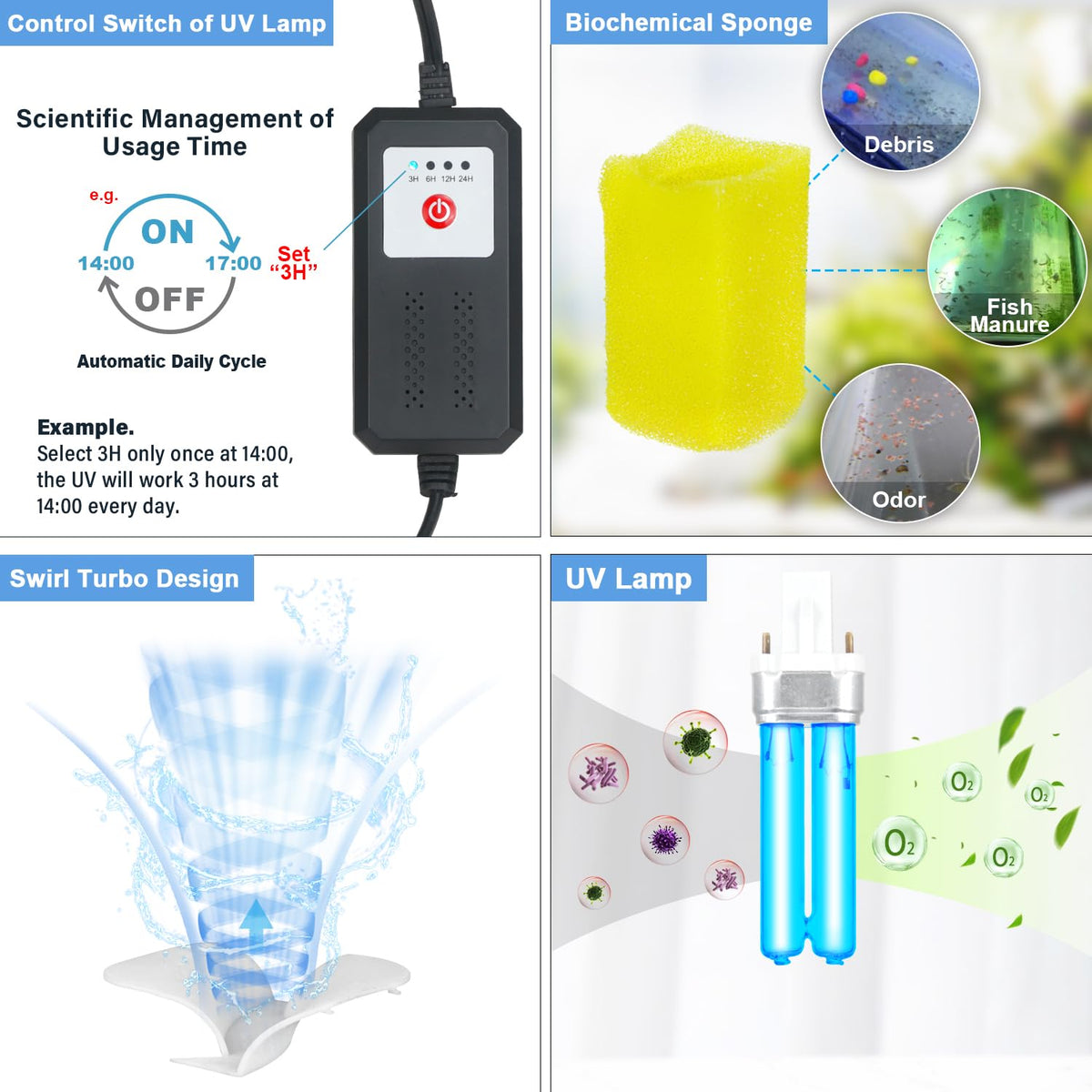 Aquarium U-V Filter For 10-40 Gal, 132 Gph Swirl Turbo Design Submersible Internal Turtle Fish Tank Filter W/Timer, Quiet Power