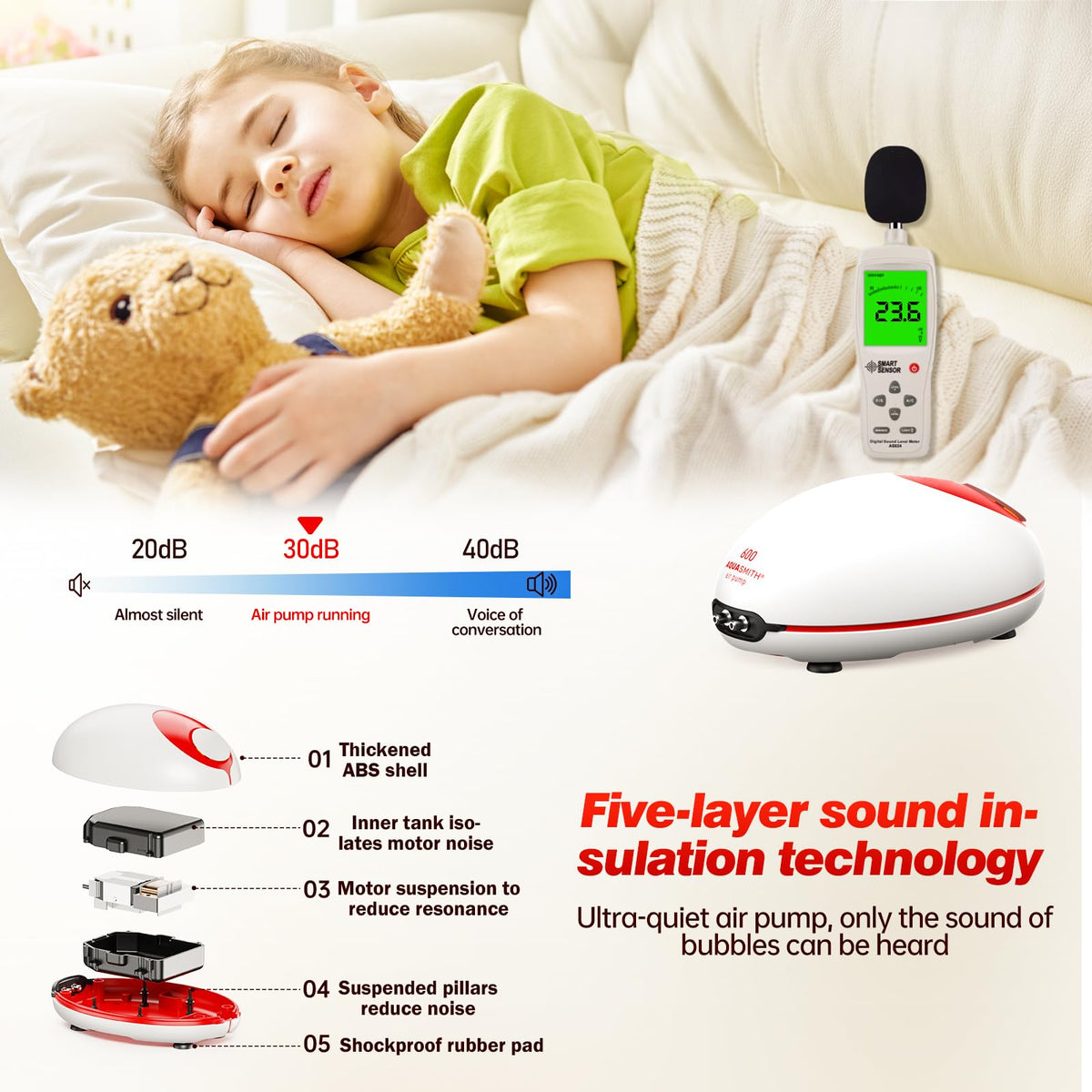 Are you looking for a quiet aquarium air pump? Our product is your ideal choice. Compared with other air pumps on the market, it has excellent silent performance, produces almost no noise, and creates a quiet environment. It is suitable for placement in the bedroom, living room or office, and will not interfere with your life and work. | This aquarium air pump is made of high-quality materials and advanced multiple sound insulation technologies. It operates very quietly and has excellent durability and stability. It can run stably for a long time and provide continuous oxygen supply for your aquarium. In the long run, it is a more economical choice.(There will be noise when the air stone and hose are not connected. It is normal and it will be quiet when connected) | This 1-watt single-hole aquarium air pump performs well. Its air flow is 24 gallons per hour, providing sufficient oxygen for the tank. The air pressure is 0.018 MPa, Suitable for fish tanks from 0 to 40 gallons, stable and moderate, ensuring a reliable gas supply without overloading the tank. | We offer not only quality products but also excellent after-sales service. If you have any issues during use, our professional customer service team is ready to help. We aim to give you the best shopping experience with no concerns. Choosing our aquarium air pump is choosing quality, quietness, and peace of mind.