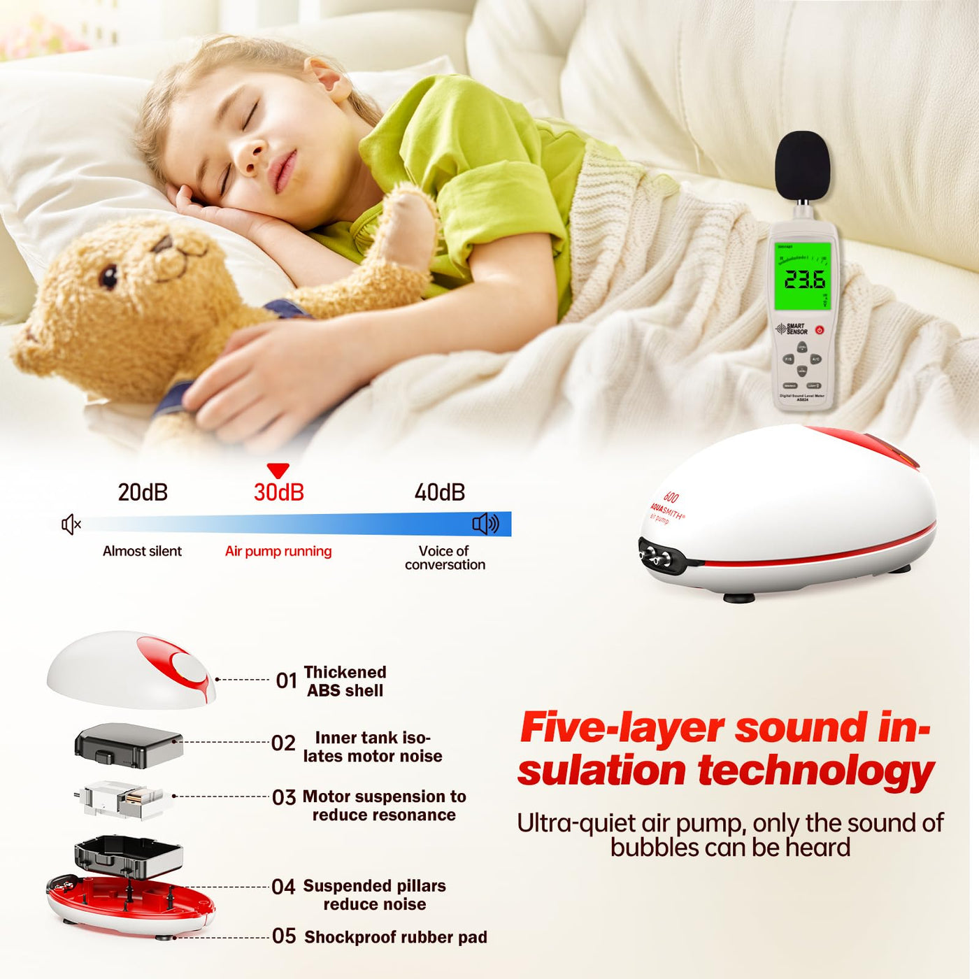 Are you looking for a quiet aquarium air pump? Our product is your ideal choice. Compared with other air pumps on the market, it has excellent silent performance, produces almost no noise, and creates a quiet environment. It is suitable for placement in the bedroom, living room or office, and will not interfere with your life and work. | This aquarium air pump is made of high-quality materials and advanced multiple sound insulation technologies. It operates very quietly and has excellent durability and stability. It can run stably for a long time and provide continuous oxygen supply for your aquarium. In the long run, it is a more economical choice.(There will be noise when the air stone and hose are not connected. It is normal and it will be quiet when connected) | This 3-watt single-hole aquarium air pump performs well. Its air flow is 95 gallons per hour, providing sufficient oxygen for the tank. The air pressure is 0.022 MPa, Suitable for fish tanks from 70 to 100 gallons, stable and moderate, ensuring a reliable gas supply without overloading the tank. | We offer not only quality products but also excellent after-sales service. If you have any issues during use, our professional customer service team is ready to help. We aim to give you the best shopping experience with no concerns. Choosing our aquarium air pump is choosing quality, quietness, and peace of mind.