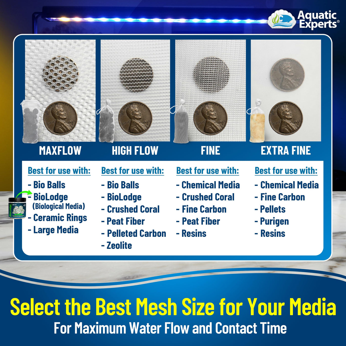 Q: What types of filter media can I use with the Aquatic Experts High Flow Filter Media Bag?A: The Aquatic Experts High Flow Filter Media Bag is designed to hold a variety of small-grained filter media, including activated carbon, peat fiber, and ion exchange resins. It is optimal for use with pelleted activated carbon and works well in both freshwater and saltwater aquariums.