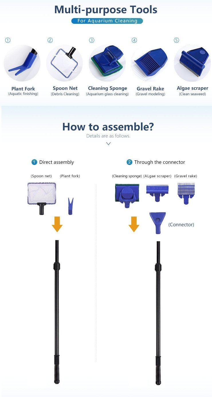 Q: What tools are included in the AquaticHI 5 in 1 Aquarium Cleaning Kit?A: The AquaticHI 5 in 1 Aquarium Cleaning Kit includes a fish net for catching fish, a gravel rake for cleaning substrate, a plant fork for arranging decorations, a cleaning sponge for tank maintenance, and an algae scraper for removing algae.