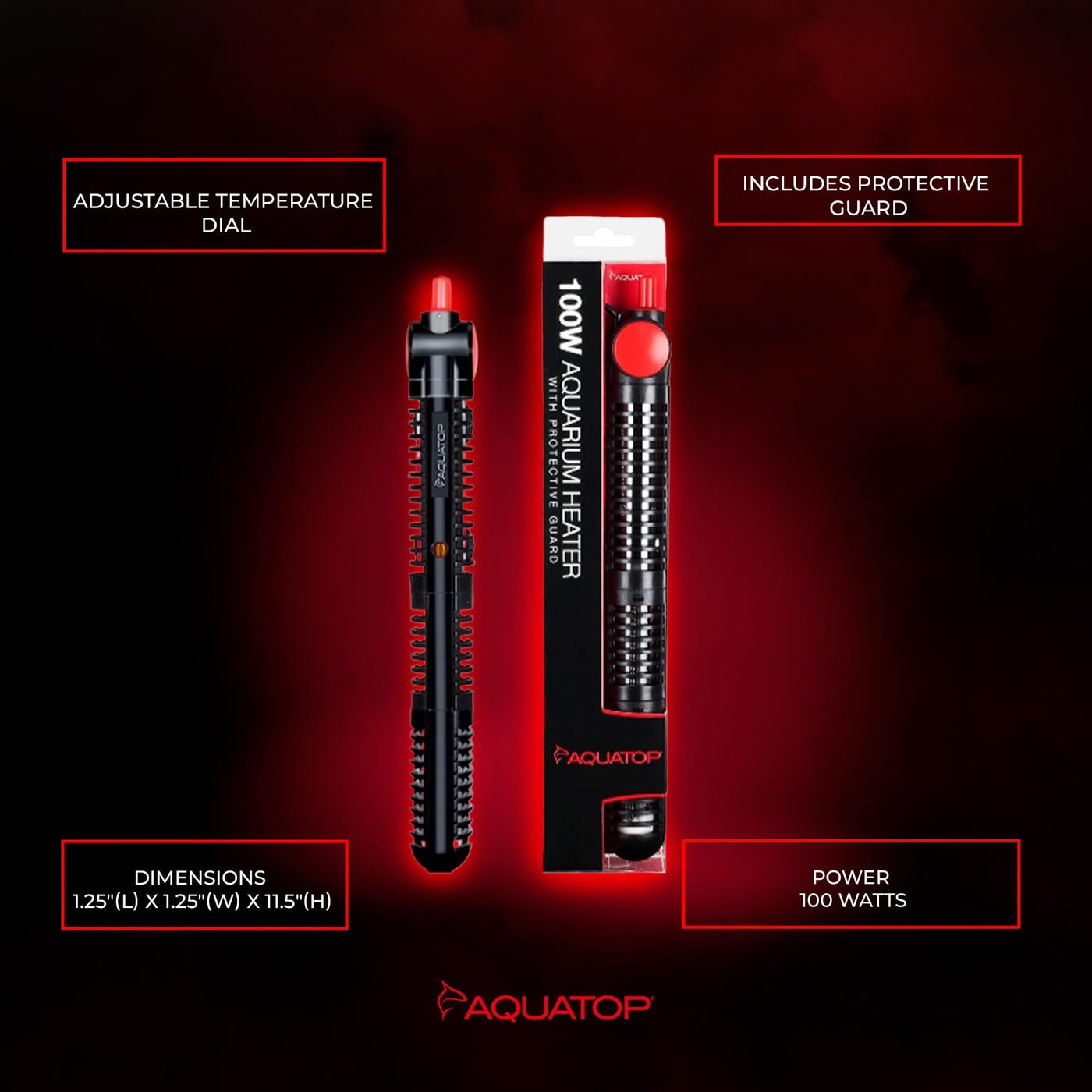 Aquatop 100W Premier Glass Heater with Guard - Submersible for Fish Tanks Up to 25 Gallons - 68-93F Adjustable Temp - Fresh & Sa
