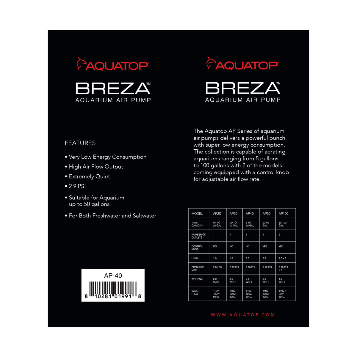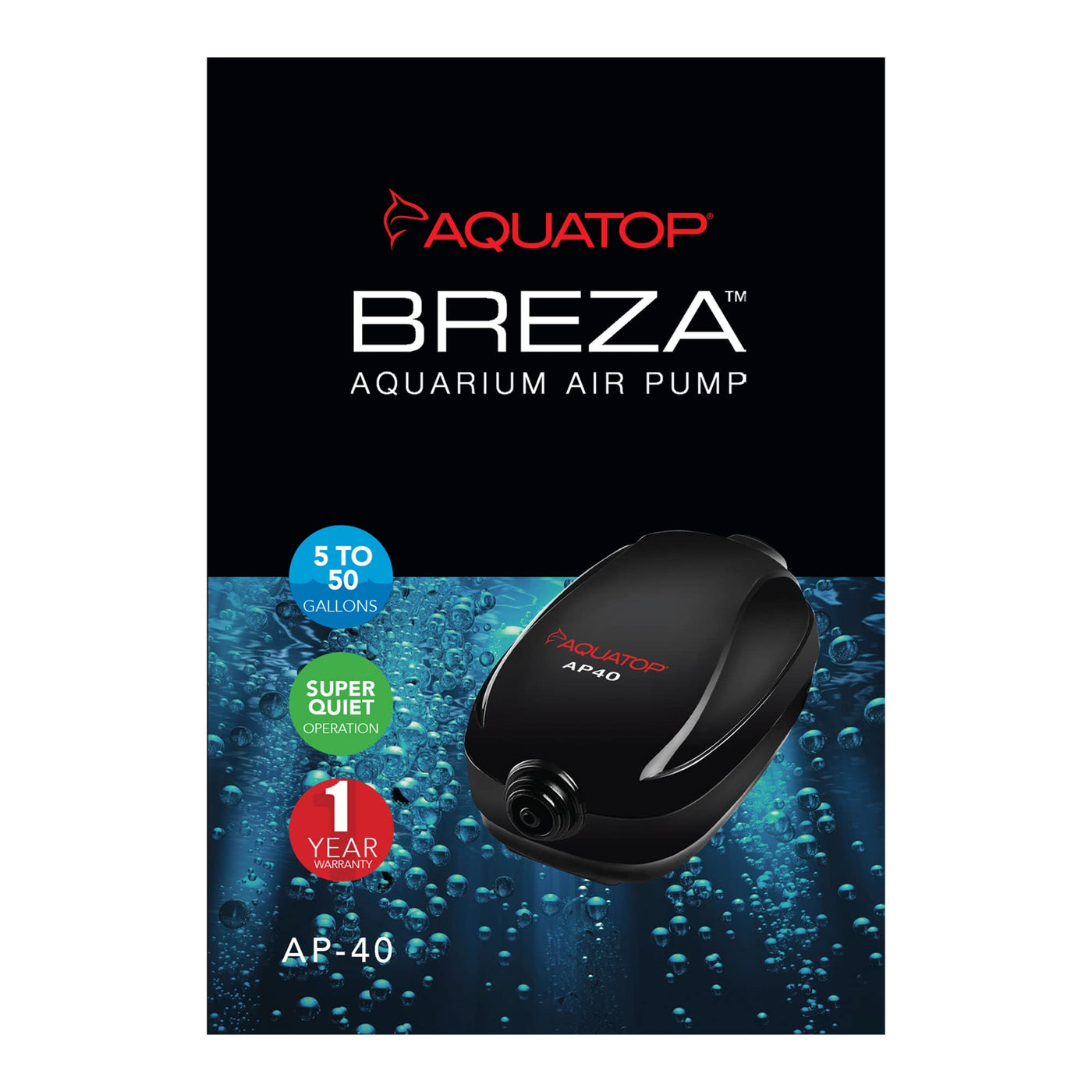 Aquatop Breza Aquarium Air Pump Single Outlet, Hi/Low output, Super Quiet, up to 50 Gal Fish Tank, AP-40