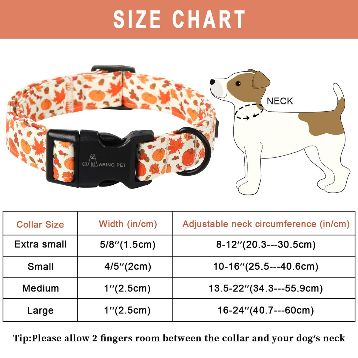 Aring Pet Dog Collar Can Make Your Dog Look Fashionable And Cute! ?The Fall Dog Collar Is Patterned With Various Leaves. It Can Fully Show The Unique Sense Of Atmosphere In The Fall. Our Fall And Halloween Dog Collar Is Made Of Polyester And Cotton, Which Is Soft, Skin Friendly. ?Please Use A Soft Ruler To Measure Your Dogs Neck. Please Make Sure Least 2 Fingers Between Collar And Dog Neck. X-Small Collar Width: 5/8'(1.5Cm), Length: 8-12'(20.3-30.5Cm). Small Collar Width: 4/5'(2Cm), Length: 10-16'(25.4-40.6Cm). Medium Collar Width: 1'(2.5Cm), Length: 13.5-22'(34-55.9Cm). Large Collar Width: 1.2'(2.5Cm), Length: 16-24'(40.6-60Cm). ?The Fabric Used To Make The Collars Is Cut Randomly, So You May Not Get The Same Product As Shown In The Picture. The Position Of The Pattern May Be Slightly Different. If There Are Any Issues With The Product, Please Contact Us.