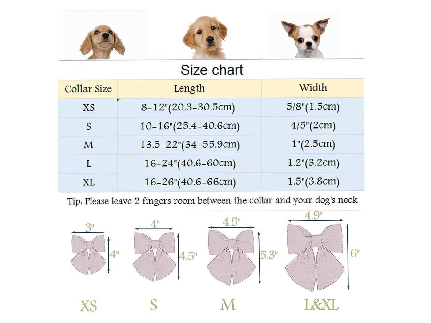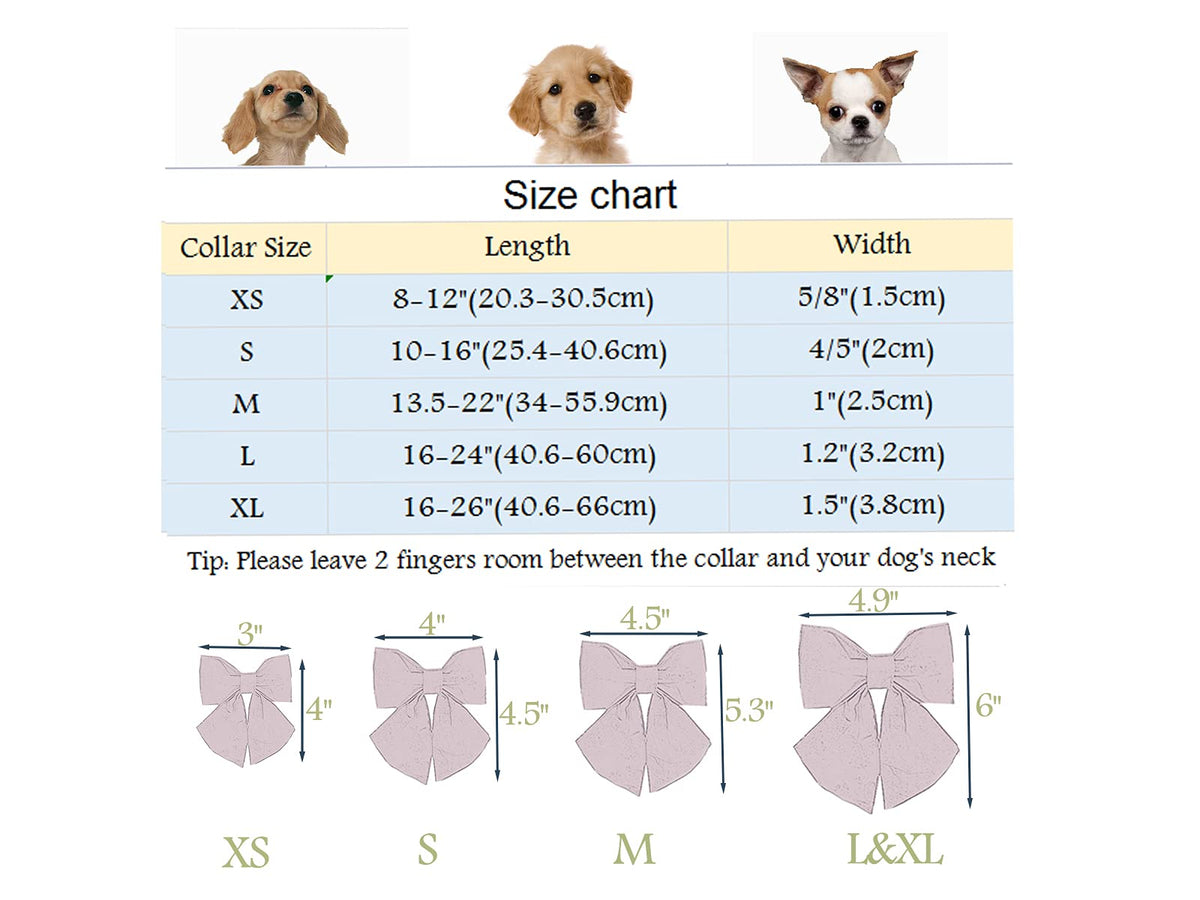 Welcome to ARING PET.We are committed to making pet products, our bowtie dog collars are unique in design,and high-quality materials make dogs comfortable to wear. Each style has five sizes to choose (XS,S,M,L,XL). Please measure the dog's neck circumference before buying.according to the size chart to make sure the correct size. Manual measurement exists 0.5-1 inch (1-3 cm) error. X-Small: Collar(Width: 5/8'', Length: 8-12''); Bowtie(Width: 3'', Length:4'' )Small: Collar(Width: 4/5'', Length: 10-16''); Bowtie(Width: 4'', Length:4.5'' )Medium: Collar(Width: 1'', Length: 13.5-22''); Bowtie(Width: 4.5'', Length:5.3'' )Large: Collar(Width: 1.2'', Length: 16-24''); Bowtie(Width: 4.9'', Length:6'' )X-Large: Collar(Width: 1.5'', Length: 16-26''); Bowtie(Width: 4.9'', Length:6'' ) We recommend hand washing, the metal buckle will be scratched if it is machine washed.