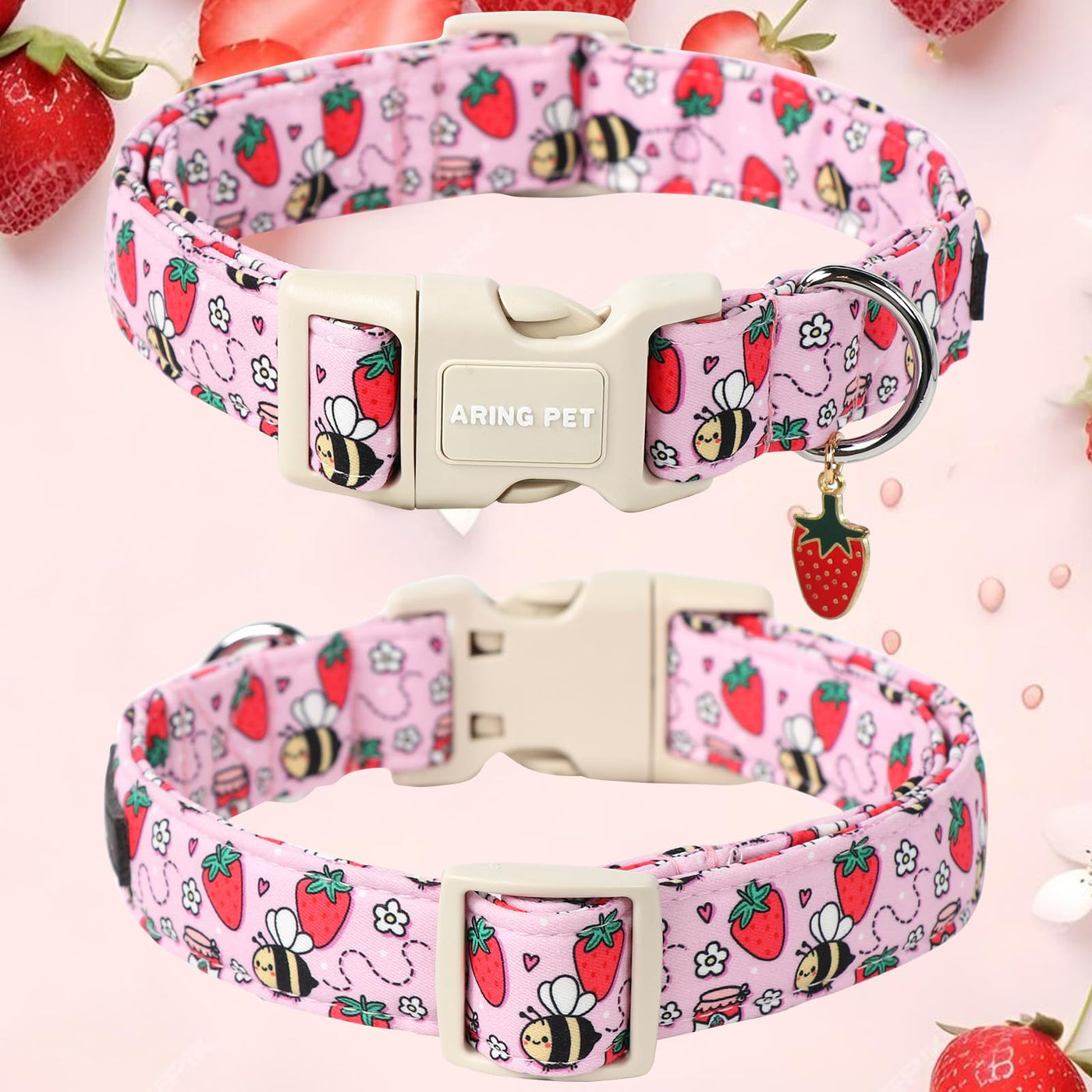 Aring Pet Summer Dog Collar-Cute Pink Dog Collar For Small Dogs, Adjustable Strawberry Bees Print Pet Collars Puppy Collar For S