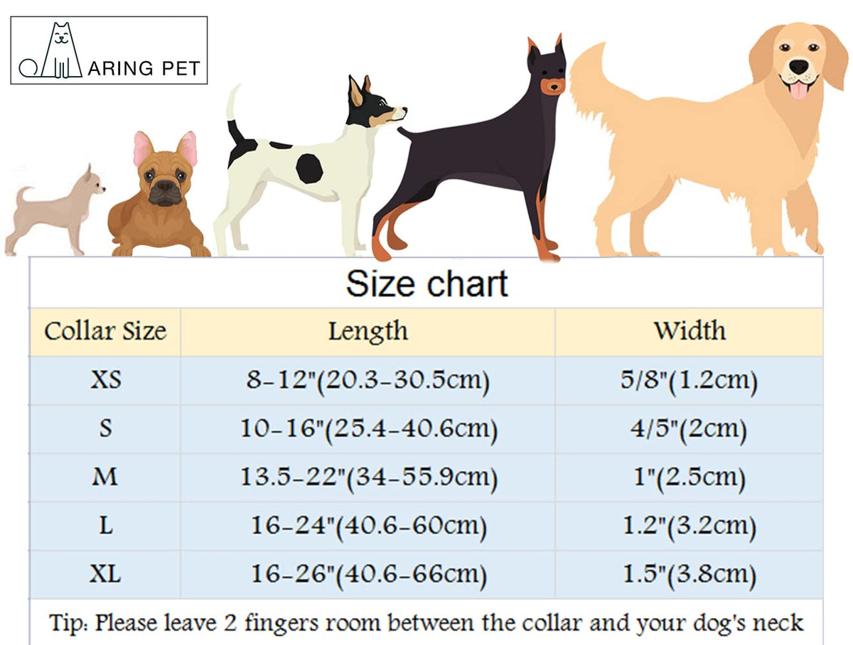 Welcome To&Nbsp;Aring Pet.Our Products Have High Quality And Exquisite Packaging, We Also Have Very Premium After-Sales Service,&Nbsp;Please Rest Assured To Choose.Warm Tips:??The Collar Needs To Be Hand Washed, Or Metal Buckle Will Be Scratched If It Is Machine&Nbsp;Washed.&Nbsp;&Nbsp;&Nbsp;&Nbsp;??Each Color Has Five Sizes To Choose (Xs,S,M,L,Xl). Please Measure The Dog 'S Neck Circumference To Make Sure Correct Size.&Nbsp;X-Small: Collar Width: 1/2 ''(1.2Cm), Collar&Nbsp;Length: 8-12 '' (20.3-30.5Cm)Small: Collar Width: 4/5 '' (2Cm), Collar&Nbsp;Length: 10-16 '' (25.4-40.6Cm)Medium: Collar Width: 1 '' (2.5Cm), Collar&Nbsp;Length: 13.5-22 '' (34-55.9Cm)Large: Collar Width: 1.2 ''(3.2Cm), Collar&Nbsp;Length: 16-24 '' (40.6-60Cm)X-Large: Collar Width: 1.5 '' (3.8Cm),&Nbsp;Collar&Nbsp;Length: 16-26 ''(40.6-66Cm)??If You Have Any Questions, Please Contact Us At Your Convenience.