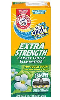 Q: How does Arm & Hammer Carpet & Room Extra Strength Odor Eliminator work?A: This product utilizes the power of ARM & HAMMER™ Baking Soda combined with OxiClean™ Dirt Fighters to neutralize tough odors deep within carpets, providing a fresh and clean environment.