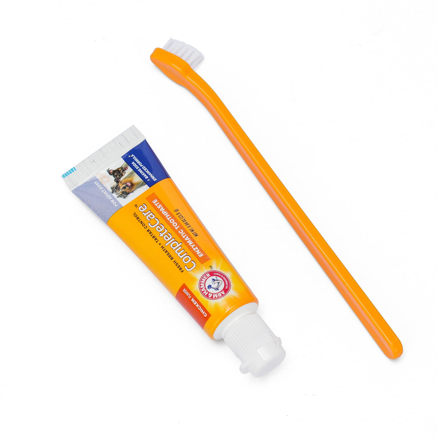 Unleash the power of baking soda with Arm and Hammer pet dental products. Arm and Hammer for Dogs products leverage the power of baking soda to clean gently and deodorize naturally. Arm & Hammer Complete Care Enzymatic Dog Dental Kit offers an advanced formula, enriched with baking soda and calcium plus calcium, The enzymatic puppy toothpaste included in this kit offers a complete care solution that is fluoride-free and nontoxic, ensuring a gentle yet effective clean for your pets teeth. This tartar control formula helps reduce plaque buildup and maintain your dogs oral health when used regularly. The kit includes a 0.84oz chicken flavor toothpaste, and a toothbrush for convenient brushing. Our toothpaste for dogs is crafted with a delicious chicken flavor that dogs love, making it easier than ever to incorporate into your pets daily routine. Plus, baking soda particles dissolve into hard-to-reach areas for lasting deodorizing and cleaning. With added calcium, this toothpaste for dogs is part of a complete dental care system. This product is cruelty-free and non-toxic, formulated without the use of any dyes. Trust the power of Arm & Hammer pet dental products for healthy pets and fresh kisses! DIRECTIONS - For first time brushers, put a small amount of toothpaste on your finger and invite your dog to lick. Use with any preferred dog tooth brush. Progress to rubbing your finger along the gum line and teeth. Once your pet is comfortable, put a small bit of toothpaste on toothbrush/finger brush and repeat the above steps. Always make teeth cleaning for dogs a positive experience for your pet.