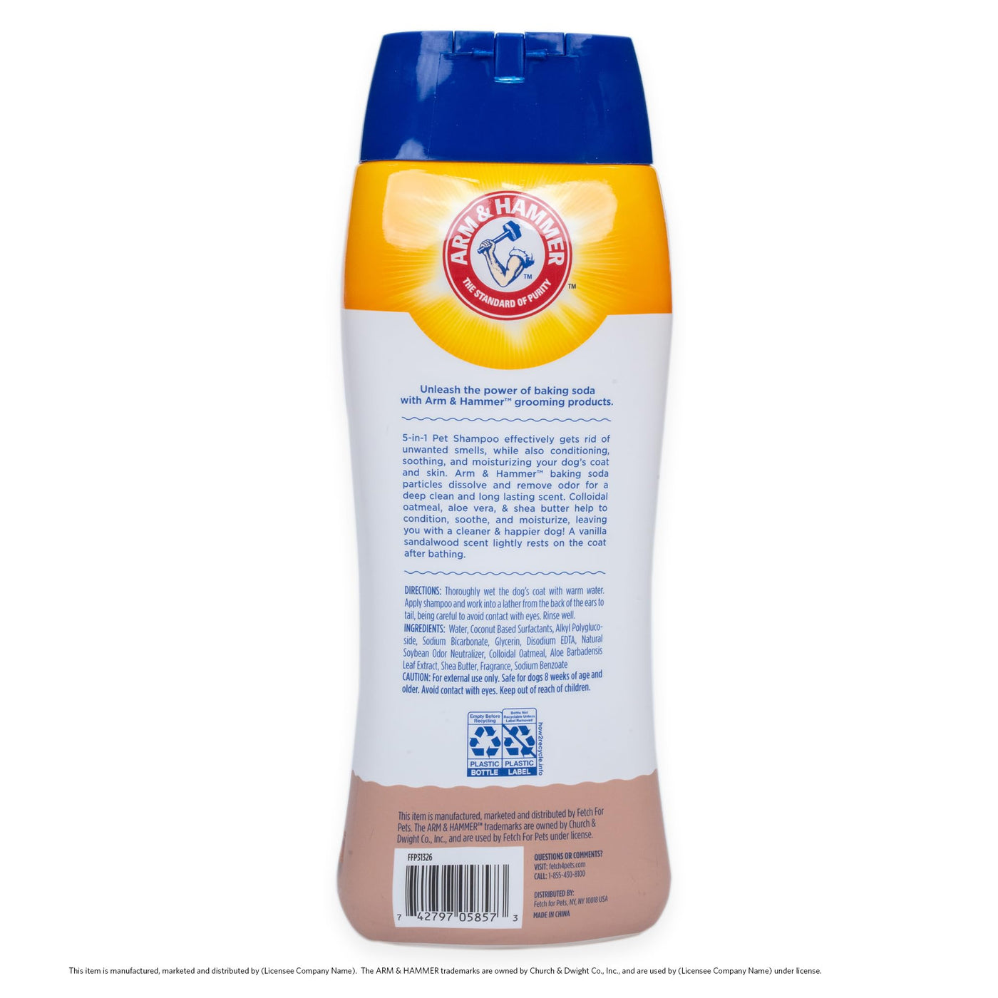 Unleash The Power Of Baking Soda With Arm & Hammer Grooming Products. This 5-In-1 Pet Shampoo Cleans And Nourishes Your Dogs Coat 5 Ways: 1. Cleansing: At Its Core, This Dog Shampoo Cuts Through Dirt And Oil To Clean Your Pups Fur. 2. Deodorizing: Infused With The Power Of Baking Soda, This Shampoo Effectively Gets Rid Of Unwanted Smells In Your Dogs Coat. 3. Conditioning: Packed With Powerful Ingredients To Condition A Variety Of Dog Fur Types, This Dog Conditioner Helps To Loosen Tangles And Makes It Easy To Brush Your Pups Fur For Regular Grooming. 4. Soothing: This Shampoo Includes Colloidal Oatmeal, A Preferred Ingredient By Dog Grooming Experts For Soothing Itchy And Irritated Skin In Dogs. 5. Moisturizing: With Extra Skin Moisturizing Ingredients Like Aloe And Shea Butter, This All-In-One Dog Grooming Solution Helps Replenish Moisture Lost During Regular Grooming Or From Dry Environments. Arm & Hammer Baking Soda Particles Dissolve And Work Into The Deepest Follicles To Remove Odor For A Deep Clean And Long-Lasting Scent. Colloidal Oatmeal, Aloe Vera, And Shea Butter Help To Condition, Soothe, And Moisturize Skin, Leaving You With A Cleaner And Happier Dog! With A Light Vanilla Sandalwood Scent That Remains On The Coat After Bathing, You And Your Dog Will Be Ready For Extra Cuddles And A Fresh New Take On The Day! Why Ph Balance Matters For Dog Shampoo: Dogs' Skin Is Less Acidic Than Human Skin, So Human Shampoos Destroy A Dog'S Skin Protective Barrier, Leaving Your Pet Vulnerable To Itchy Flaking. Arm & Hammer Dog Grooming Products Are Ph Balanced Specifically For Dogs To Maintain A Healthy Skin Barrier, Keeping Your Dogs Coat Nourished, Healthy, And Clean. Directions: Thoroughly Wet The Dogs Coat With Warm Water. Apply Shampoo And Work Into A Lather From The Back Of The Ears To Tail, Being Careful To Avoid Contact With Eyes. Rinse Well.