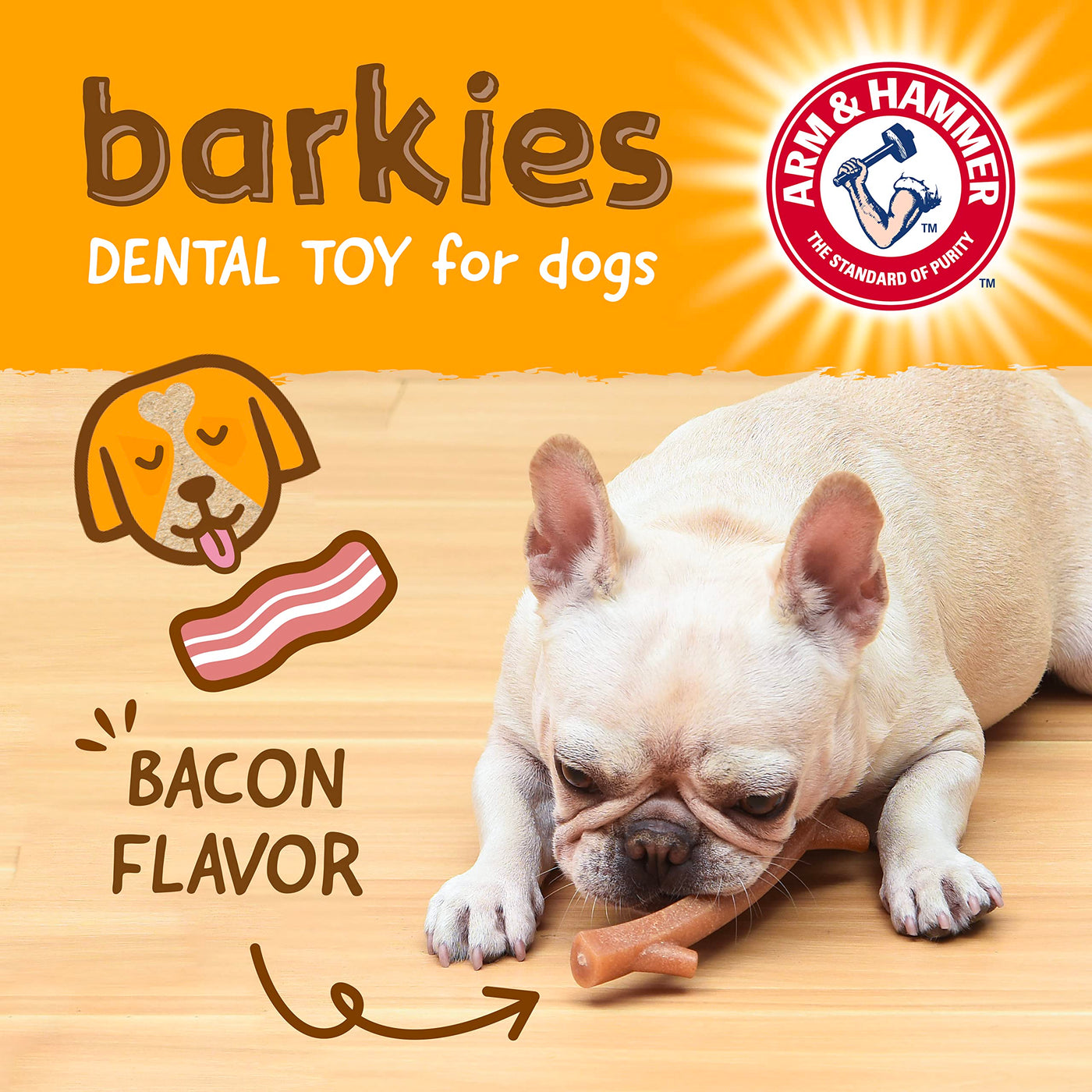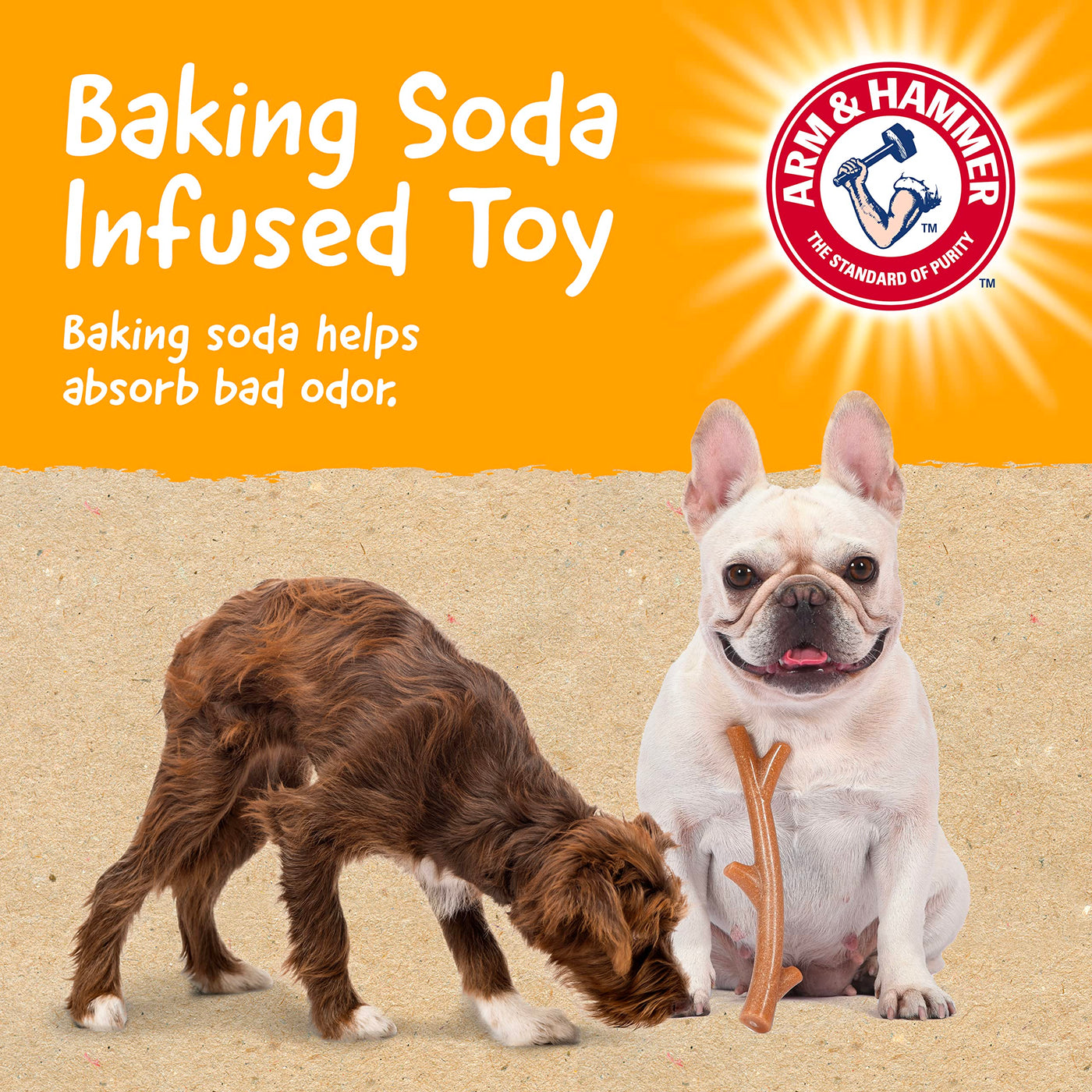 Only Arm & Hammer™ could create a splinter-safe stick that doubles as both a fun toy and a healthy dental chew. Made from blended and compressed natural wood fiber with pet-safe synthetic material, this chew toy replicates the sensory experience dogs love about chewing wood, but in a safer and sturdier chew toy. Additionally, this dog chew is infused with signature Arm & Hammer™ Baking Soda. Baking soda helps to absorb bad odor and has been shown to contribute to whitening teeth. Enjoy a few rounds of fetch with Fido’s new favorite stick, then let him entertain himself for hours with chewing! With an easy-to-grip shape for hours of easy chewing, delicious flavors, and signature Arm & Hammer™ Baking Soda, this is one chew toy that is approved by both dogs and pet parents alike! The Barkies Tree Branch measures 8” long and is bacon flavored. This faux stick is a more durable and safer alternative dog chew toy that is designed for dogs to enjoy chewing for hours without causing splinters that injure the gums. Plus, eco-friendly packaging and recyclable materials support Arm & Hammer™’s mission to offer versatile, effective, environmentally safe, and economical pet health products. When selecting your Arm & Hammer™ chew toys, select the proper size & chew type for your dog's age, chew strength, & weight. Please supervise use & remove all separated parts. Product is not intended to be eaten or ingested. Arm & Hammer™ is the trusted name in gentle, yet effective cleaning for over the past 100 years. Now Arm & Hammer™ for Pets brings those same cleaning methods to our companion animals, becoming a leading dental brand in the pet space with a wide variety of products aiming to make it easier for pet parents to care for their canine companions. Check out our full line of Arm & Hammer™ for Pets products that offer an easy way for pet parents to find dental health solutions that work.