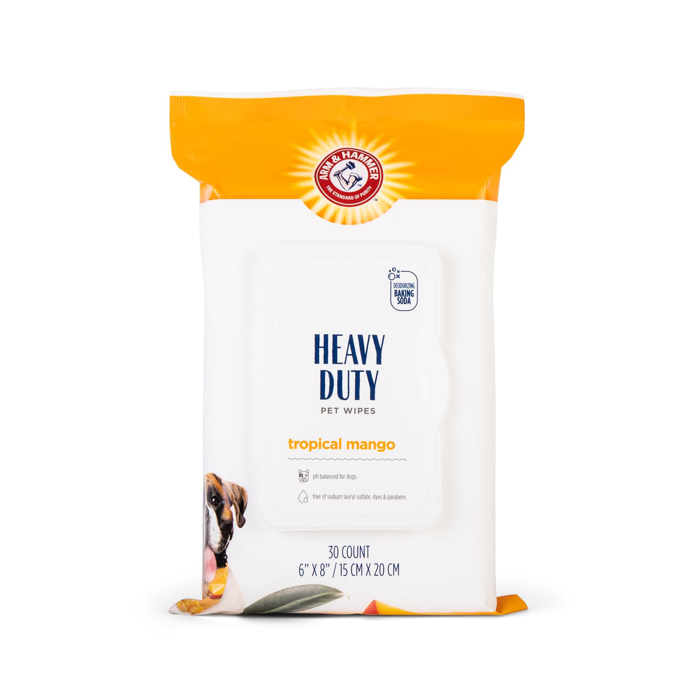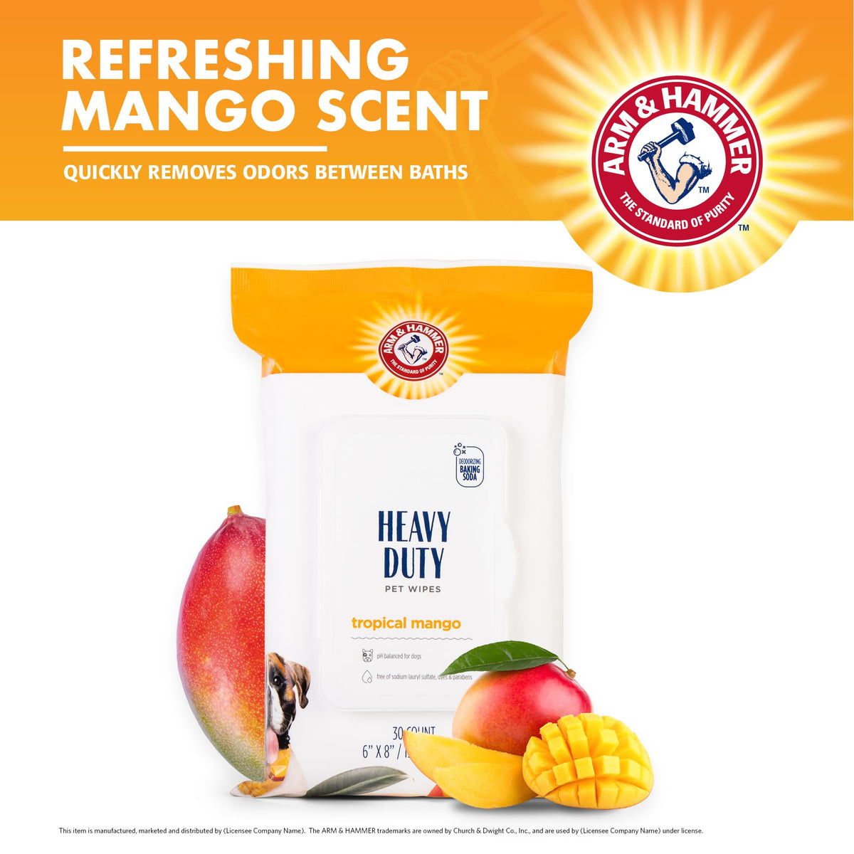 Unleash the power of baking soda with Arm & Hammer pet grooming products. Arm & Hammer leverages the power of baking soda to refresh a stinky dog coat and eliminate odor. These heavy duty pet wipes in mango scent will make keeping your dog clean a pleasant experience for you and your pet. Perfect for traveling with dogs, this small pack of 30 dog wipes make it easy to clean up paws after a walk before heading into your car or hotel, as well as quick tidy-ups after messes. Arm & Hammer heavy duty bath wipes are a durable solution for quick tidy-ups between bath time. These wipes remove any excess debris and are enhanced with baking soda particles that dissolve and eliminate odors. A long lasting and sweet mango scent is left behind for all day freshness. These gentle wipes are free of harsh chemicals. These dog wipes are safe to use with topical treatments. Use these pet wipes as part of your pet travel kit to make it easier than ever to keep your pup smelling fresh anytime, anywhere. Gentle enough to use as dog face wipes (avoid the eyes), dog poop wipes or dog butt wipes, paw wipes, or general dog deodorizing wipes. Arm & Hammer Pets makes it convenient to clean up your pets with natural, high quality ingredients! DIRECTIONS: 1. Gently wipe down pet from head to tail, carefully avoiding eyes. 2. Dispose of wipes in trash. Do not flush. 3. Close package when not in use to keep moist. Safe for use on pets 8 weeks and older. WARNINGS: For external use only. Safe for dogs 8 weeks of age and older. Avoid contact with eyes. Keep out of reach of children. YOUR SATISFACTION IS OUR PRIORITY*: If you have any questions or feedback, please reach out to us at Fetch for Pets.