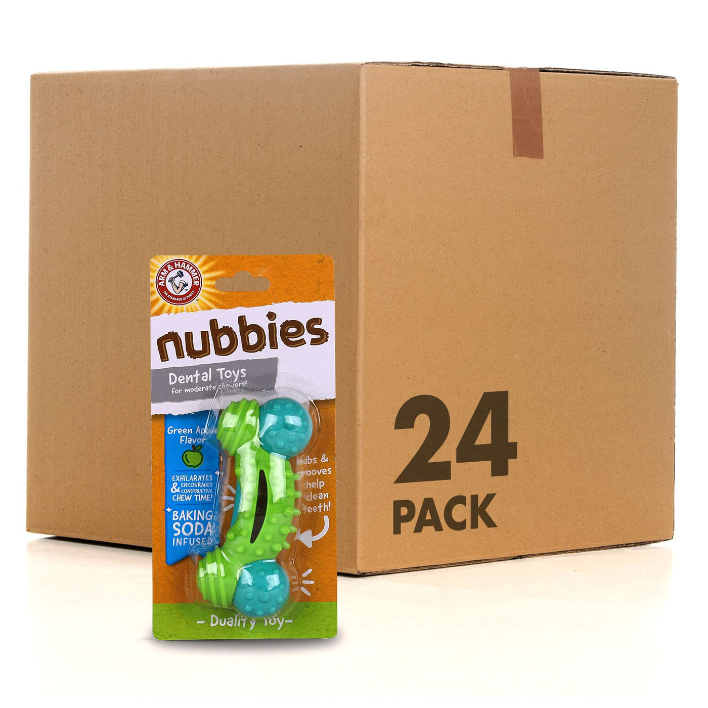 The Arm & Hammer Nubbies Duality Bone Dental Toy For Dogs Is The Ideal Dog Dental Toy To Turn Destructive Behavior Into Productive, Positive Playtime. Infused With Baking Soda To Naturally Eliminate Odors, This Dog Toy Is Made With Nylon & Tpr For Durability. It Is A Great Dog Toy For Light To Medium Chewers. The Nubs And Grooves Help Clean Teeth Without A Toothbrush. Plus, Dogs Love The Green Apple Flavor. Dogs Enjoy Chewing Their Way To Better Dental Health With The Arm & Hammer Nubbies Duality Dental Dog Toy.This Dog Dental Toy Is A Great Way To Reward Your Dog With A Dog Toy That Keeps On Giving. It Turns Chewing Into Positive Playtime While Helping Clean Your Dog'S Teeth. This Dog Chew Dental Tool Helps Remove Plaque And Tartar From Your Dog'S Teeth As Dogs Chew. As With All Dental Tools For Dogs, When Selecting Your Arm & Hammer Chew Toy, It Is Important To Select The Proper Size And Chew Toy For Your Dog'S Age, Chew Strength, And Weight. As With All Dog Chew Toys, Please Supervise Use And Remove All Separate Parts.Pet Parents Can Also Look Into Our Arm & Hammer Dog Toothpastes And Dog Dental Care Kits For More Dog Oral Care And Dog Oral Hygiene Solutions. All Products Come With Arm & Hammer Baking Soda As A Key Ingredient To Help Naturally Deodorize And Freshen Breath. Dog Toothbrushes Come In Multiple Sizes And Varieties For All Dogs, Both Large And Small. Arm & Hammer Also Makes Dog Dental Treats Like Nubbies Dog Dental Treats, Treadz Dog Dental Treats, Dog Dental Chews, Rawhide Free Dog Treats, Fruit Twister Dog Treats, And More! Be Sure To Check Out Our Full Collection.Your Satisfaction Is Our Priority. For Any Questions Or Feedback, Please Reach Out To Us Directly Via Email.