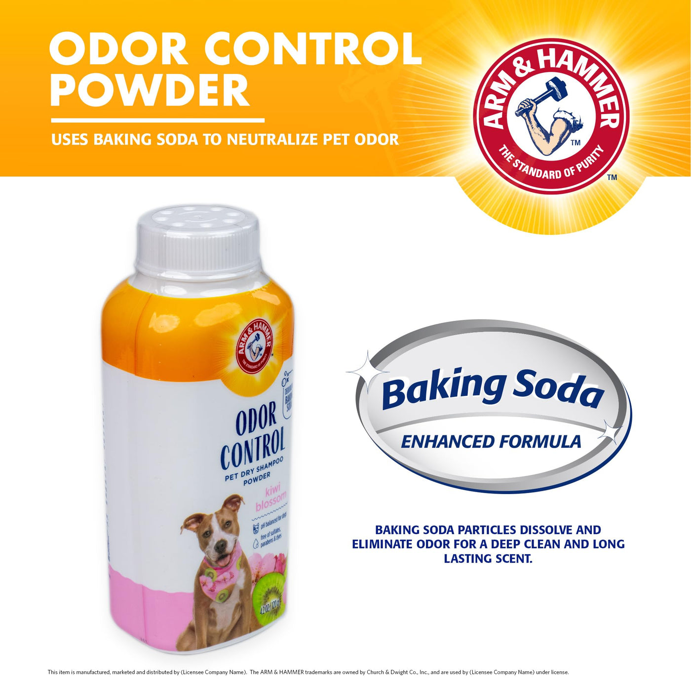 Bathe Your Dog With The Name You Trust. Arm & Hammer Uses The Power Of Baking Soda To Refresh A Stinky Dog Coat And Neutralize Odor. The Baking Soda Dissolves Into Fine Particles, Getting Into Hard-To-Reach Areas, Resulting In A Deeper Clean. Arm & Hammer For Pets Odor Control Powder Effectively Gets Rid Of Unwanted Smells From Your Dogs Coat, Skin, Ears, And Paws, While Also Providing Oil Absorption For A Quick And Easy Clean Between Baths. Arm & Hammer Baking Soda Particles Dissolve And Remove Odor For A Deep Clean And Long-Lasting Scent. A Sweet Kiwi Blossom Scent Lightly Rests On The Coat After Use. This Dry Shampoo Powder Will Make It Easy To Deodorize Dogs Between Baths, And It Is Safe To Use With Topical Treatments. Our Formula Is Gentle Enough For All Dogs And Puppies 8 Weeks And Older To Use, And Leaves Behind A Sweet Smell That Youll Both Love! Directions: For Use On Your Dogs Body, Shake Loose Powder Onto Your Pets Fur, Working Along The Spine And Spreading Out Toward The Sides With Your Fingers Or Brush. Allow Powder To Sit For A Few Minutes, And Then Brush Off. For Use On Paws, Shake Powder Onto Your Dogs Paws And Gently Massage In A Circular Motion Between Toes And Pads. Wipe Off Any Remaining Powder With A Clean Cloth. For Use On Ears, Shake Powder Onto A Clean Cloth Or Cotton Ball. Gently Rub Around The Top Of The Ear Canal. Always Close Lid After Use To Reduce Chances Of Clumping. For External Use Only. Safe For Dogs 8 Weeks Of Age And Older. Avoid Contact With Eyes. Keep Out Of Reach Of Children.