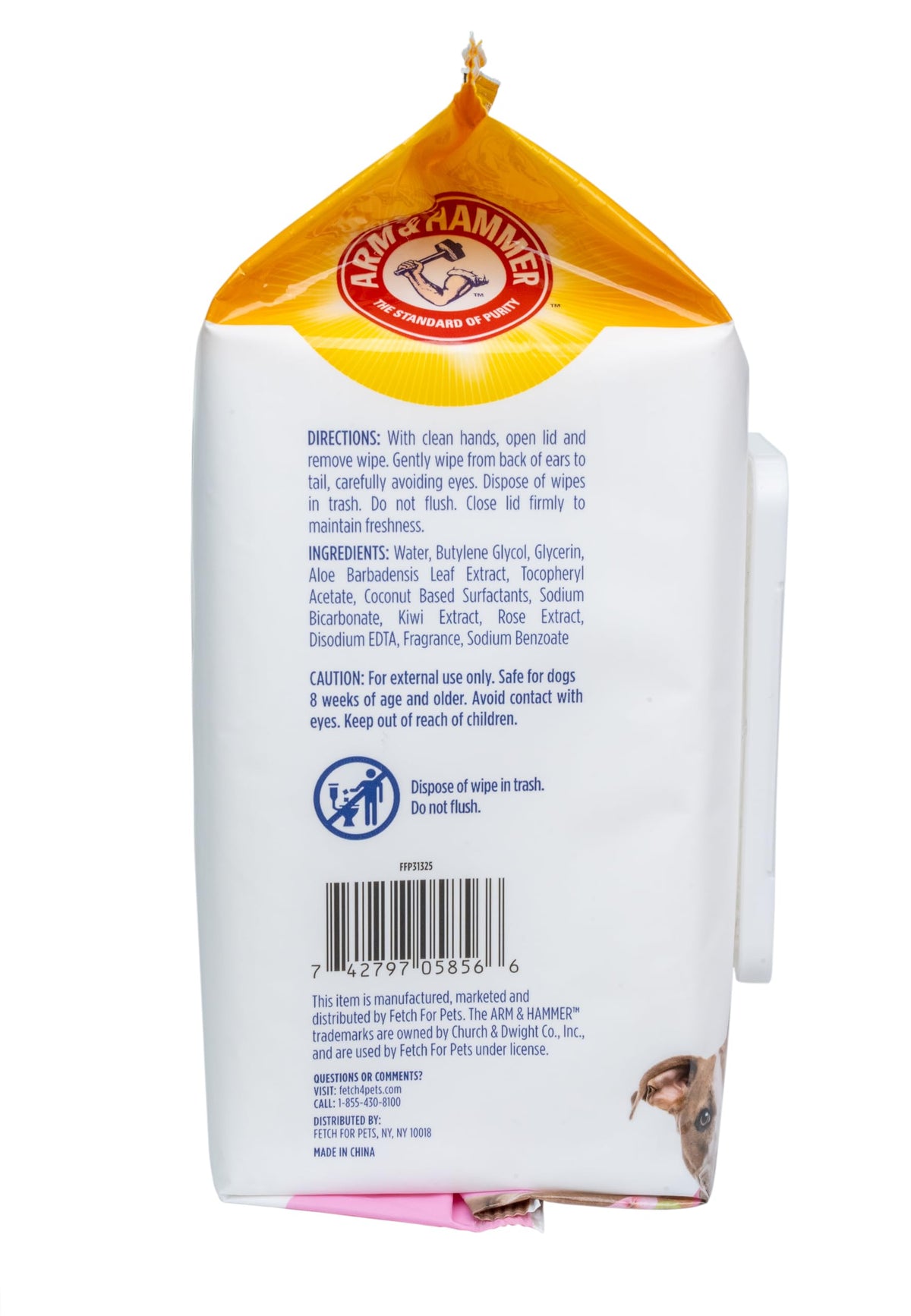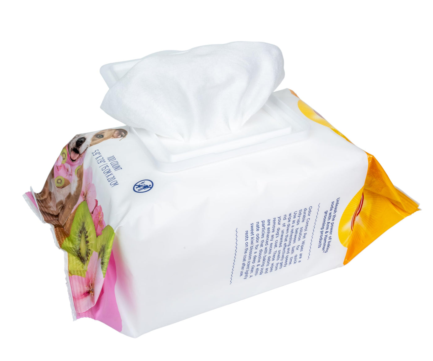 Groom your dog with the name you trust. Arm & Hammer™ uses the power of baking soda to refresh a stinky dog coat and eliminate odor. The baking soda dissolves into fine particles, getting into hard-to-reach areas, resulting in a deeper clean. Arm & Hammer for Pets Odor Control Wipes effectively get rid of unwanted smells from your dog’s coat, skin, ears, and paws for a quick and easy clean between baths. Arm & Hammer baking soda particles dissolve and remove odor for a deep clean and long-lasting scent. A sweet kiwi blossom scent lightly rests on the coat after use. These scented pet wipes will make keeping your dog clean a pleasant experience for you and your pet and is safe to use with topical treatments. Arm & Hammer dog bath wipes are a durable solution for quick tidy-ups between bath time. Clean paws after a walk or use as a refreshing and speedy wipe down. These wipes remove any excess debris and are enhanced with baking soda particles that dissolve and eliminate odors. A long lasting and pleasant kiwi blossom scent is left behind for all day freshness. These gentle wipes are free of harsh chemicals. DIRECTIONS: With clean hands, open lid and remove wipe. Gently wipe from back of ears to tail, carefully avoiding eyes. Dispose of wipes in trash. Do not flush. Close lid firmly to maintain freshness. WARNINGS: For external use only. Safe for dogs 8 weeks of age and older. Avoid contact with eyes. Keep out of reach of children.
