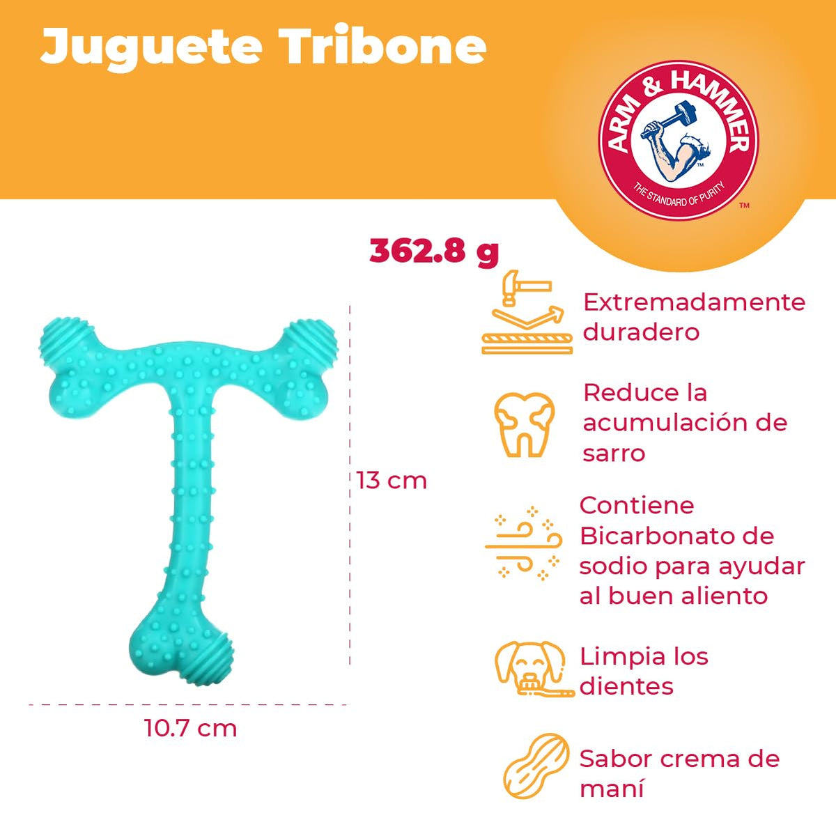 Q: What is the unique design of the Arm & Hammer Nubbies T-Bone Chew Toy?A: The Arm & Hammer Nubbies T-Bone Chew Toy features a unique Tri-bone shape that allows dogs to easily grasp the toy between their front paws, enabling them to chew comfortably with their back teeth. This design keeps dogs engaged for hours while promoting dental health.