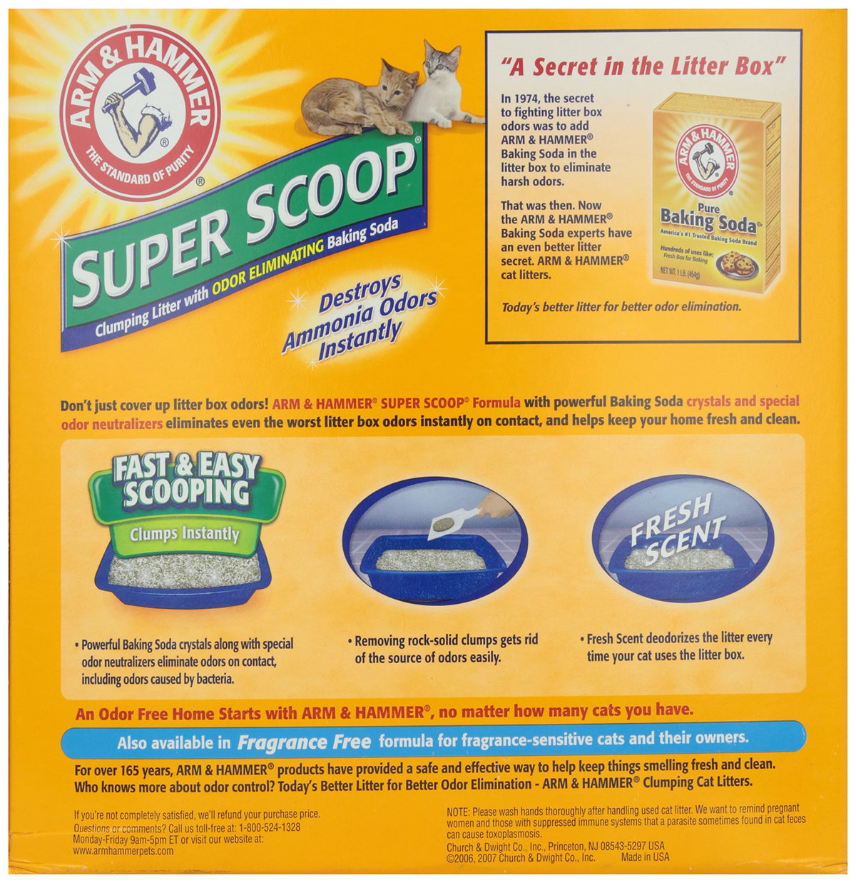 ARM & HAMMER Super Scoop Cat Litter is a low tracking clumping litter with super absorbent clay, concentrated odor eliminators and ARM & HAMMER Baking Soda to destroy tough odors on contact! Rock solid clumps for easy removal.