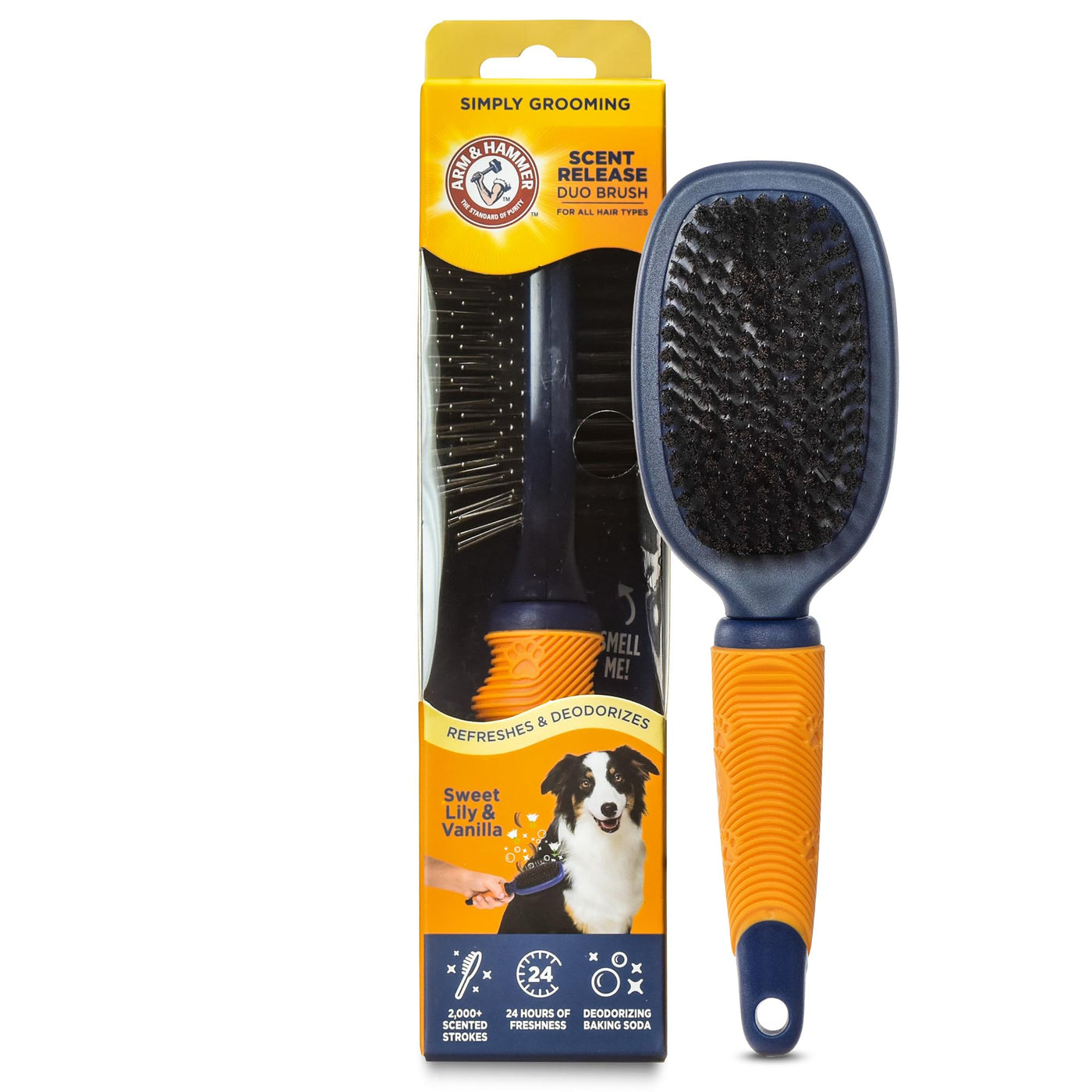 Keep grooming simple, soothing, and scent-sational with the Arm & Hammer Simply Calm Dog Grooming Slicker Brush. This 2-in-1 grooming tool is ideal for dogs of all coat types, especially long-haired breeds. One side features soft bristles that smooth the coat and remove dirt and dander, while the pin side gently detangles and reduces shedding without irritating sensitive skin. While you brush, our patented scent transfer technology releases a gentle Sweet Lily & Vanilla fragrance into your dogs coat, delivering up to 2,000 strokes of long-lasting scent. (It is recommended that you store your grooming glove in the original box to preserve the fragrance.) Infused with Arm & Hammer baking soda, this scented dog brush doesnt just mask odors-it helps eliminate them, leaving your pup fresher, cleaner, and ready for cuddles. For more than 165 years, Arm & Hammer has been the trusted name in gentle, yet effective, cleaning. Arm & Hammer for Pets brings those same cleaning methods to our companion animals.