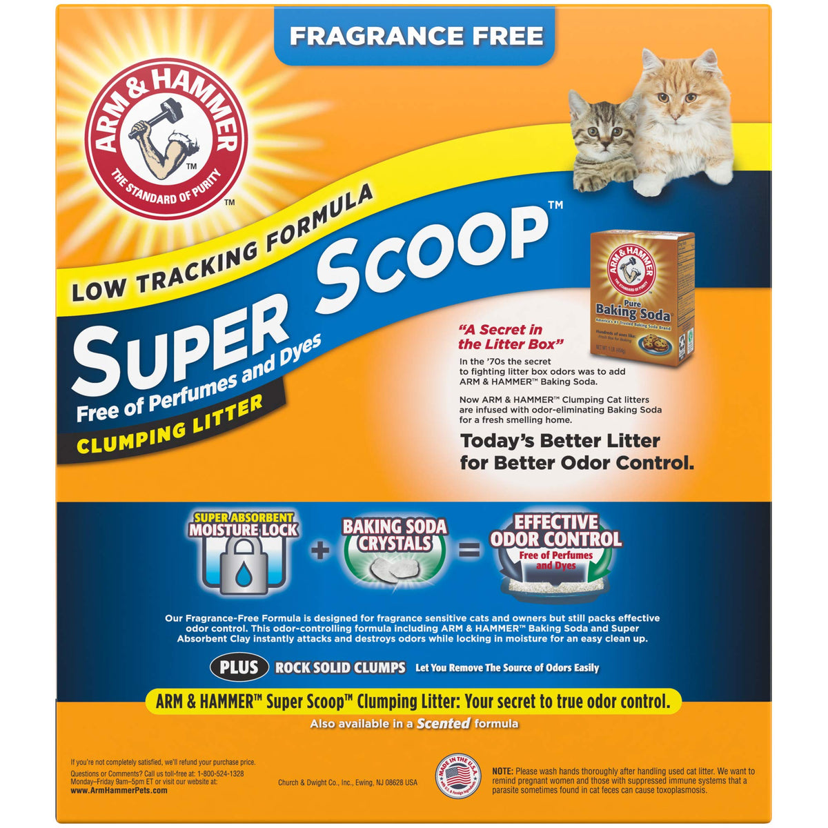 ARM & HAMMER Super Scoop Cat Litter is a low tracking clumping litter with super absorbent clay and ARM & HAMMER Baking Soda to eliminate odors. Specially designed formula for fragrance sensitive cats and their owners that forms rock solid clumps for easier scooping.