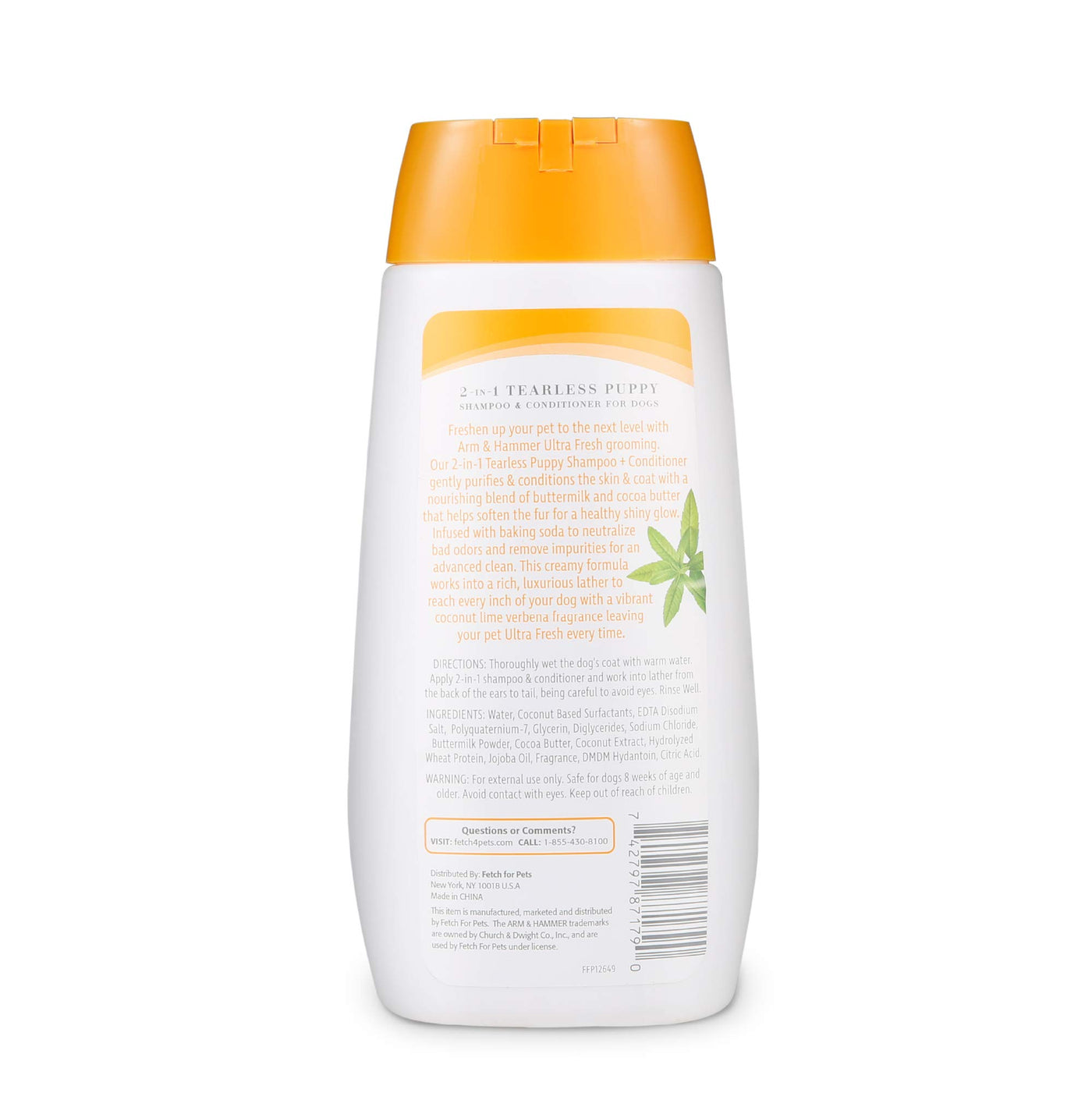 Freshen up your pet to the next level with Arm & Hammer Ultra Fresh grooming. Our 2-in-1 Tearless Puppy Shampoo + Conditioner gently purifies & conditions the skin & coat with a nourishing blend of buttermilk and coco butter that helps soften the fur for a healthy shiny glow. This puppy shampoo and conditioner is infused with baking soda to neutralize bad odors and remove impurities for an advanced clean. The creamy formula of this puppy shampoo and conditioner works into a rich, luxurious lather to reach every inch of your dog with a vibrant coconut lime verbena fragrance leaving your pet Ultra Fresh™ every time. Regular bathing is an important part of pet care; clean, fresh smelling dogs are more welcome in many places than dirty, smelly dogs. Bathe your dog just the way you'd like to - from head to tail - with Arm & Hammer Ultra Fresh dog grooming products. Suitable for dogs of all ages, this doggie shampoo and conditioner is specifically designed to give your pet a clean, fresh smell. DIRECTIONS: Thoroughly wet the dog's coat with warm water. Apply shampoo and work into lather from the back of the ears to tail, being careful to avoid eyes. Rinse well.INGREDIENTS: Water, Coconut Based Surfactants, EDTA Disodium Salt, Polyquaternium-7, Glycerin, Diglycerides, Sodium Chloride, Buttermilk Powder, Cocoa Butter, Coconut Extract, Hydrolyzed Wheat Protein, Jojoba Oil, Fragrance, DMDM Hydantoin, Citric Acid. WARNINGS: For external use only. Safe for dogs 8 weeks of age and older. Avoid contact with eyes. Keep out of reach of children.