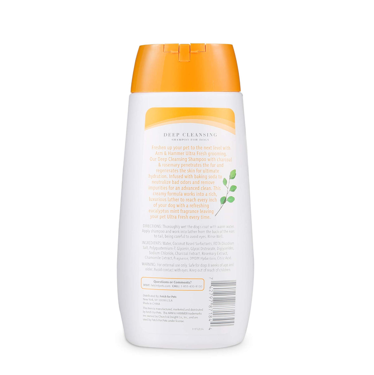 Freshen up your pet to the next level with Arm & Hammer Ultra Fresh grooming. Our 2-in-1 Deep Cleansing Shampoo in Eucalyptus Mint penetrates the fur and regenerates the skin for ultimate hydration. Made with Charcoal & Rosemary, this dog shampoo is infused with baking soda to neutralize bad odors and remove impurities for an advanced clean. The creamy formula of this dog shampoo works into a rich, luxurious lather to reach every inch of your dog with a refreshing eucalyptus mint fragrance leaving your pet Ultra Fresh™ every time. Regular bathing is an important part of pet care; clean, fresh smelling dogs are more welcome in many places than dirty, smelly dogs. Bathe your dog just the way you'd like to - from head to tail - with Arm & Hammer Ultra Fresh deep cleansing dog shampoo. Give your dog a fragrant bath with the Arm & Hammer Ultra Fresh eucalyptus mint dog shampoo. Suitable for dogs of all ages, this deep cleansing doggie shampoo is specifically designed to give your pet a clean, fresh smell. DIRECTIONS: Thoroughly wet the dog's coat with warm water. Apply shampoo and work into lather from the back of the ears to tail, being careful to avoid eyes. Rinse Well.INGREDIENTS: Water, Coconut Based Surfactants, EDTA Disodium Salt, Polyquaternium-7, Glycerin, Glycol Distearate, Diglycerides, Sodium Chloride, Charcoal Extract, Rosemary Extract, Chamomile Extract, Fragrance, DMDM Hydantoin, Citric Acid.WARNINGS: For external use only. Safe for dogs 8 weeks of age and older. Avoid contact with eyes. Keep out of reach of children.
