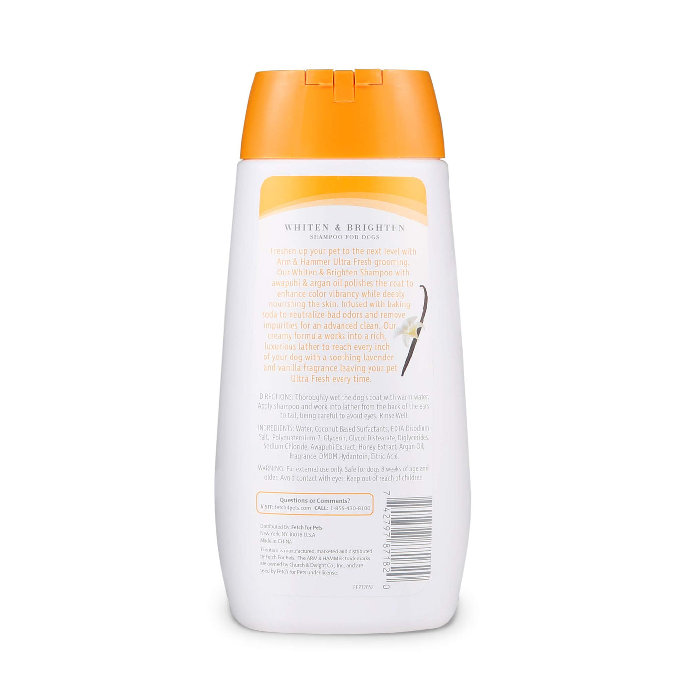 Freshen up your pet to the next level with Arm & Hammer Ultra Fresh grooming. Our Whitening & Brightening Shampoo in a Lavender and Vanilla scent polishes the coat to enhance color vibrancy while deeply nourishing the skin. Made with Awapuhi & Argan Oil, this whitening dog shampoo is infused with baking soda to neutralize bad odors and remove impurities for an advanced clean. Our creamy formula works into a rich, luxurious lather to reach every inch of your dog with a soothing lavender and vanilla fragrance leaving your pet Ultra Fresh™ every time. Regular bathing is an important part of pet care; clean, fresh smelling dogs are more welcome in many places than dirty, smelly dogs. Bathe your dog just the way you'd like to - from head to tail - with Arm & Hammer Ultra Fresh dog grooming products. Give your dog a fragrant bath with the Arm & Hammer Ultra Fresh Lavender Vanilla Dog Shampoo. Suitable for dogs of all ages, this whitening and brightening doggie shampoo is specifically designed to give your pet a clean, fresh smell. DIRECTIONS: Thoroughly wet the dog's coat with warm water. Apply shampoo and work into lather from the back of the ears to tail, being careful to avoid eyes. Rinse Well. INGREDIENTS: Water, Coconut Based Surfactants, EDTA Disodium Salt, Polyquaternium-7, Glycerin, Glycol Distearate, Diglycerides, Sodium Chloride, Awapuhi Extract, Honey Extract, Argan Oil, Fragrance, DMDM Hydantoin, Citric Acid.WARNINGS: For external use only. Safe for dogs 8 weeks of age and older. Avoid contact with eyes. Keep out of reach of children.