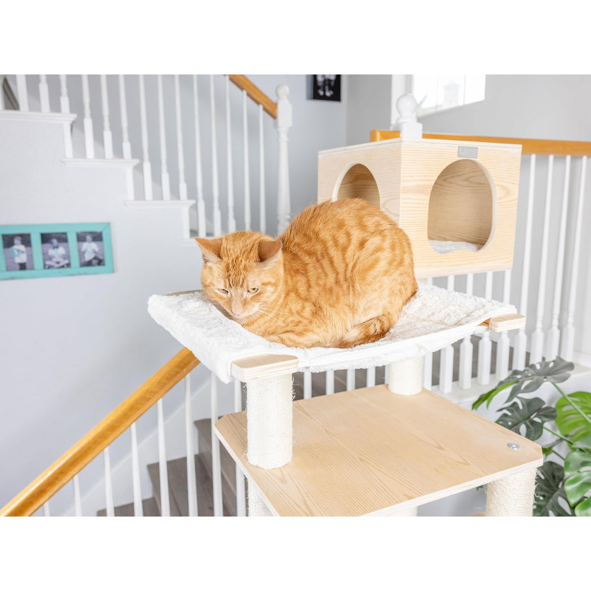 The Armarkat model S8902 premium Scots pine cat tree is built for multiple cats. This cat tree has a double base with a soft perch and two playhouses. The seven-level structure is constructed of plywood veneers. It has a polished surface, original wood grain, and natural Scots pine scent. Model S8902 is easy to assemble with tools and step-by-step instructions. F & B bullet: the cat condo is made of multi-layer solid wood, which is strong and tough while not easy to fracture. Plenty of sisal scratching post areas are built in for maximum scratching fun. Double-layered base platforms for extra strength and superior balance, each with a comfortable place for your cat to rest and relax. Height of 89 cat tree provides a higher and larger bounce space for your cats. Post diameter: 3.5 overall Dimensions:49(L) x 34(W) x 89(H) base Dimensions:24 x 19 playhouse Dimensions:14(L) x 14(W) x 12(H) and 16(L) x 16(W) x 12(H) perch Dimensions:18 x 18 maximum holding weight: 80 lbs.