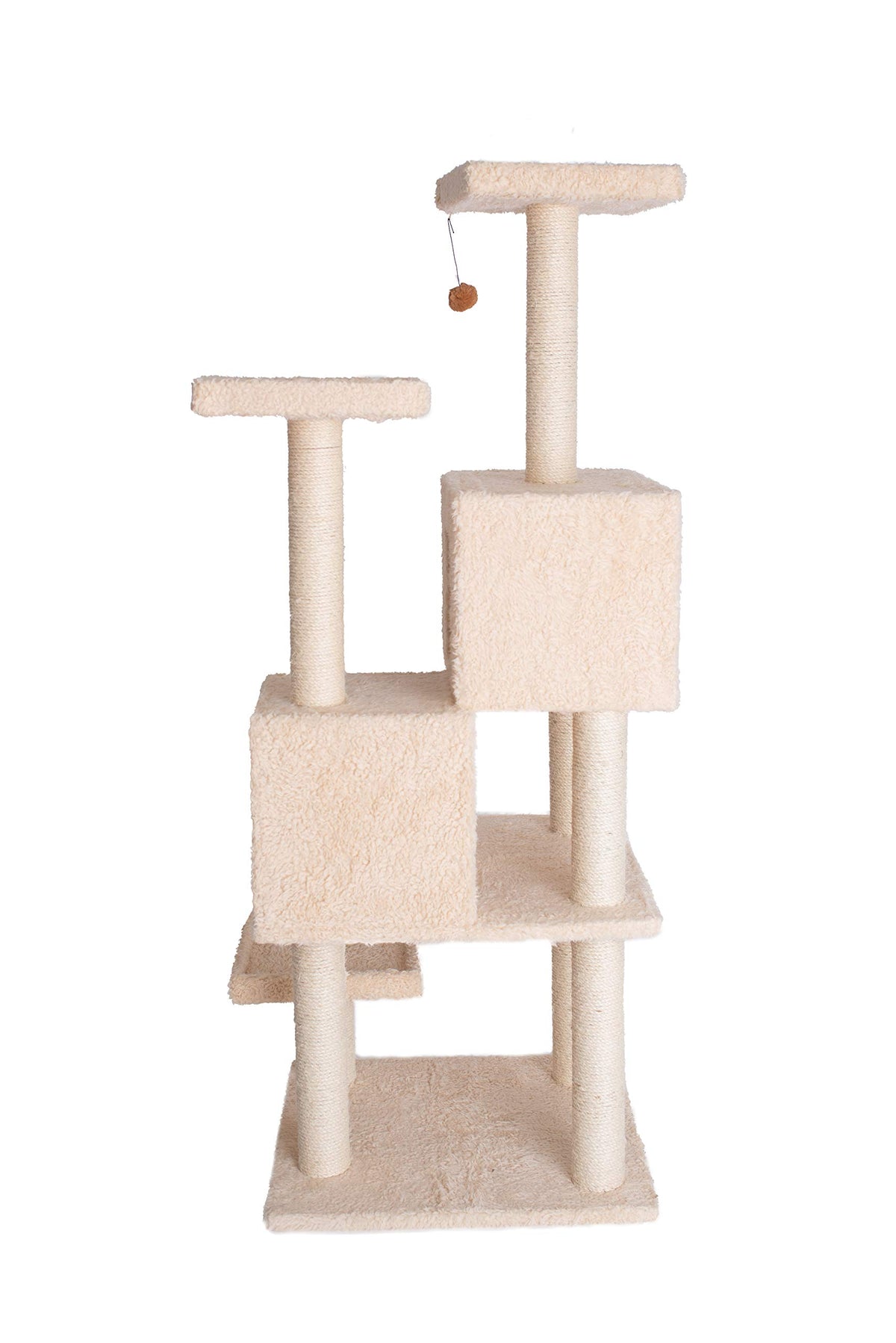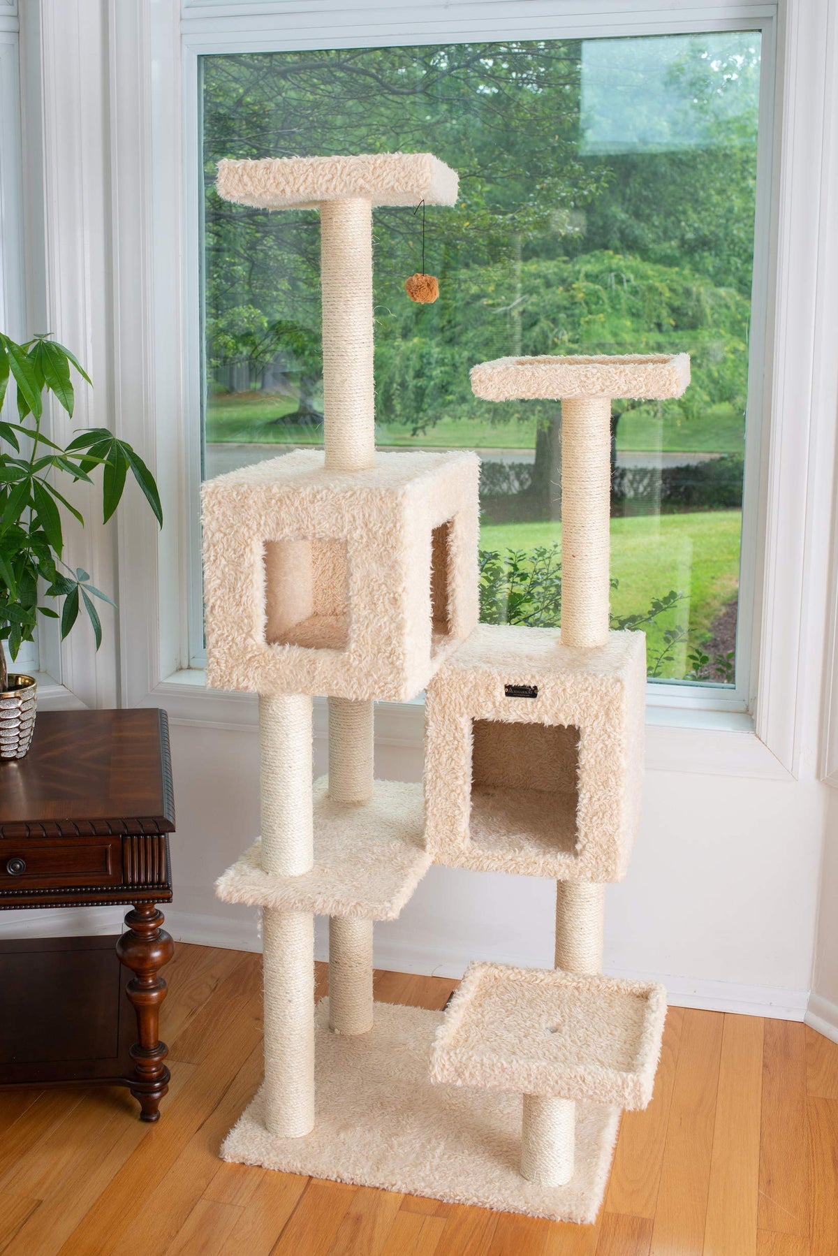 Armarkat model no. A6702 is cat daddy approved by noted cat behaviorist Jackson galaxy and features 2 cat playhouses, perches, sisal 100% cured sisal rope for scratching.a tunnel playhouse, hammock, hanging ball toy and sisal rope toy, and multiple perches for your cats enjoyment. F and B Bullet: beige with high density and ultra-thick faux fur covering for felines comfort and soft, coverings are permanently adhered to wood structures. Well constructed of 15mm pressed wood material, making it not only thicker but stronger. 100% Natural, seasoned sisal rope wraps all posts securely for years of scratch. Dimensions:post diameter: 3.5; base dimension: 26 x 24; playhouse dimension: 14(L) x 14(W) x 13(H); 14(L) x 20(W) x 13(H); perch Dimensions:14 x 14 Max holding weight: 60 lbs. Six-months warranty included. Replacement parts available from manufacturer.