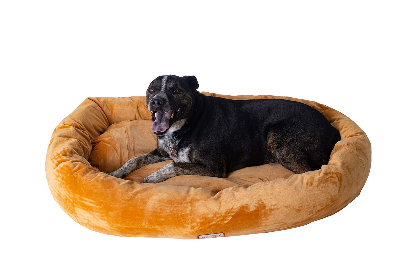 Pet Bed: D02cZS L Soft Velvet with waterproof and skid free base Filled with extra thick 100-percent poly fill for maximum comfort Zippered opening for easy cover removal waterproof lining for easy cleaning Machine washable color: Brown Size: Large Dimensions: Interior: 35-inch by 22 Exterior: 43-inch L x 30-inch W x 6-inch H