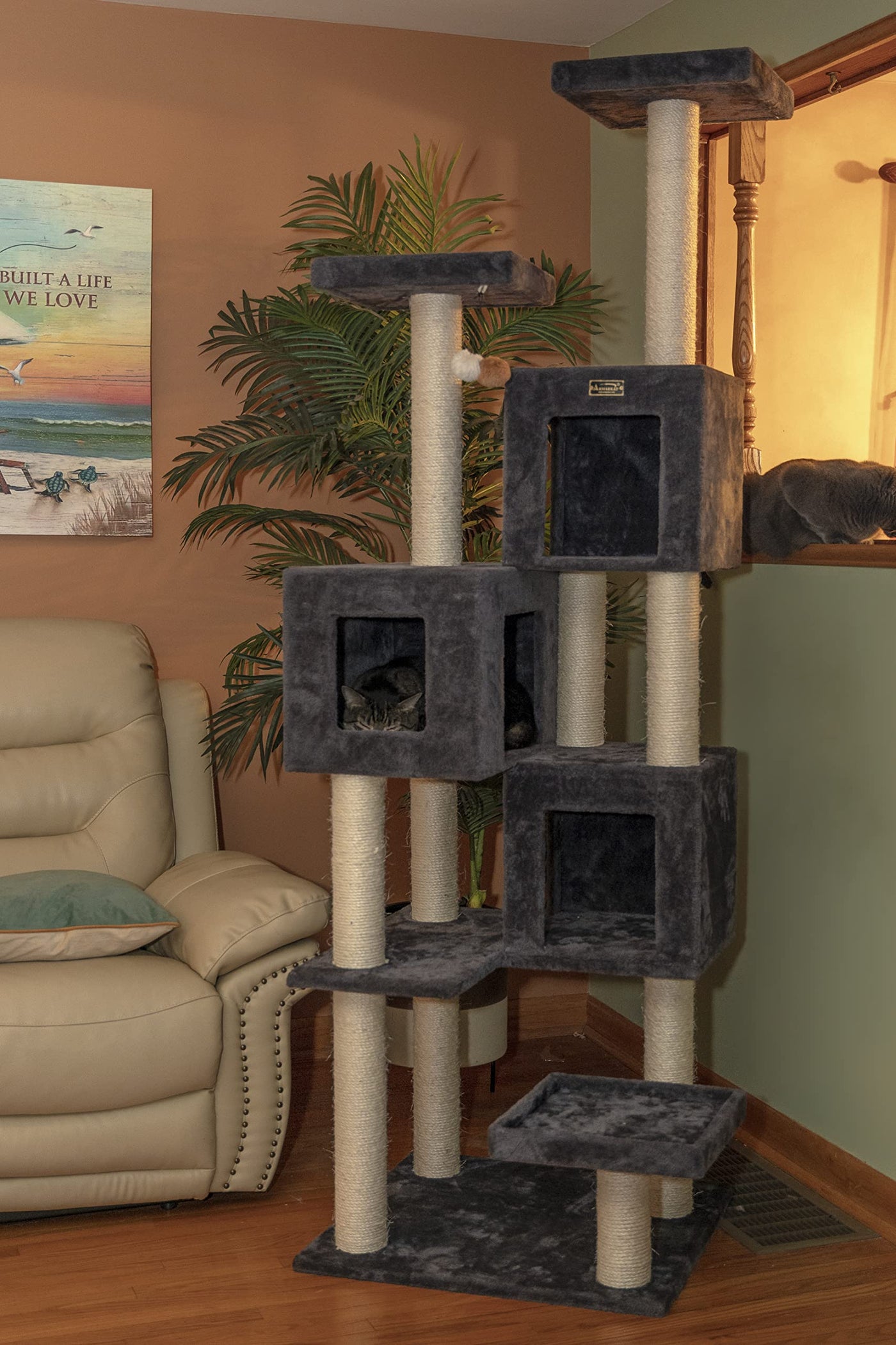 Extra-large cat tree with all scratching posts fully wrapped with natural, seasoned sisal rope that is durable and scratch-resistant. Great tree for keeping your felines far away from your furniture, since this is where they will prefer to sharpen their claws and get their daily exercise. Seven platforms offer pets plenty of choices to climb, play, lounge, and rest. Cats can play on the bottom and climb to the cozy condos to have a quiet, restful nap. They can jump to the top perch to observe their kingdom and enjoy bird watching. Dangling balls provide extra fun. This Classic Cat Tree is deep gray faux fur over pressed wood. Made of 100% eco-friendly material for no harm to pets. With well-proportioned lines and strong posts, it is sturdy and practical. A double-layered base ensures the stability of the entire cat tree. Safety strap included for extra stability if anchoring to wall. Three roomy condos offer luxurious space to hide or nap; three plush perches with bolstered edges allow cats to enjoy resting; with interactive puffy balls to complete the tree. Dimensions: Overall Dimensions: 26 (L) x 24 (W) x 80 (H) Post Diameter: 3.5 Base: 26 (L) x 24 (W) Playhouse Dimensions: 13.5(L) x 13.5(W)x 13(H) & 20(L) x 13.5(W) x 13.5(H); Perch Dimensions: 13.5 x 13.5; Package-1 Size: 27.5 (L) x 24 (W) x 16 (H) Package-2 Size: 14 (L) x 14 (W) x 14.5 (H) Gross Weight: 69 lbs. Net Weight: 67 lbs. Maximum holding weight: 80 lbs.