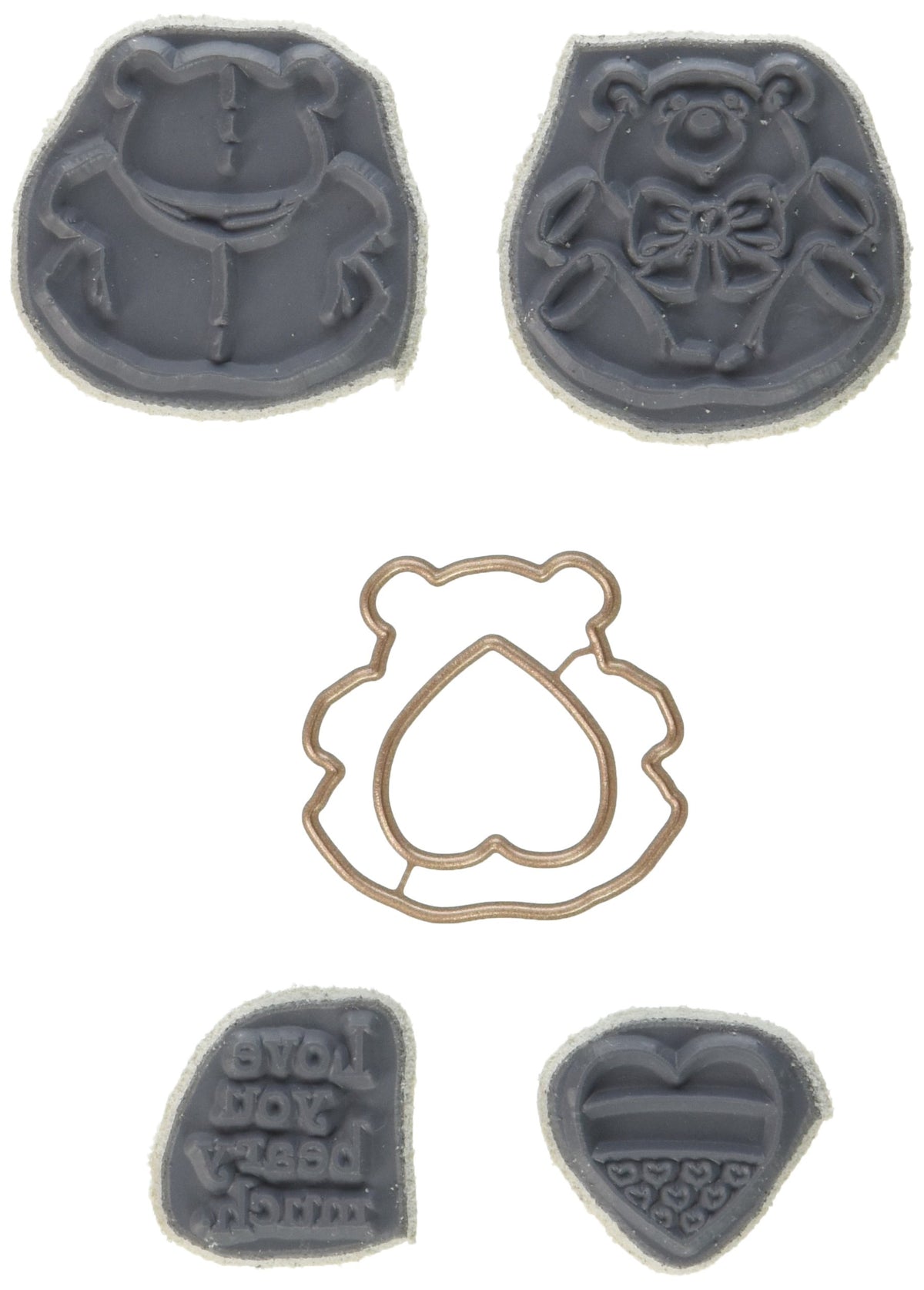Q: What is included in the Art Impressions Mini Spinners Stamp & Die Set?A: The Art Impressions 4736 Mini Spinners Stamp & Die Set includes a complete set of 4 cling rubber stamps featuring a teddy bear front, teddy bear back, and heart stamps, along with 2 matching metal dies to create intricate designs.