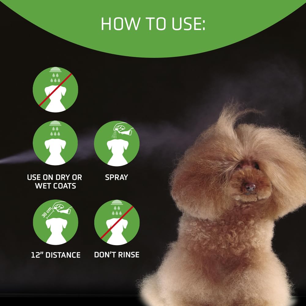 About the Product Its anti-static properties allow for brushing to be effortless. Able to de-matt and keep matt free between brushing. Its volumizing effect allows for a better finish in dense, curly and long coats. How to use? Shake well, then spray the area and begin brushing. When using on a wet coat, towel dry first. Then, spray mix and begin brushing. No need to rinse out product, just dry into the coat. when using on a dry coat, spray directly on the coat and begin to brush. Can also be used as a scissoring spray.